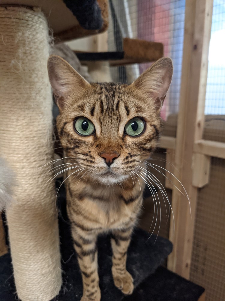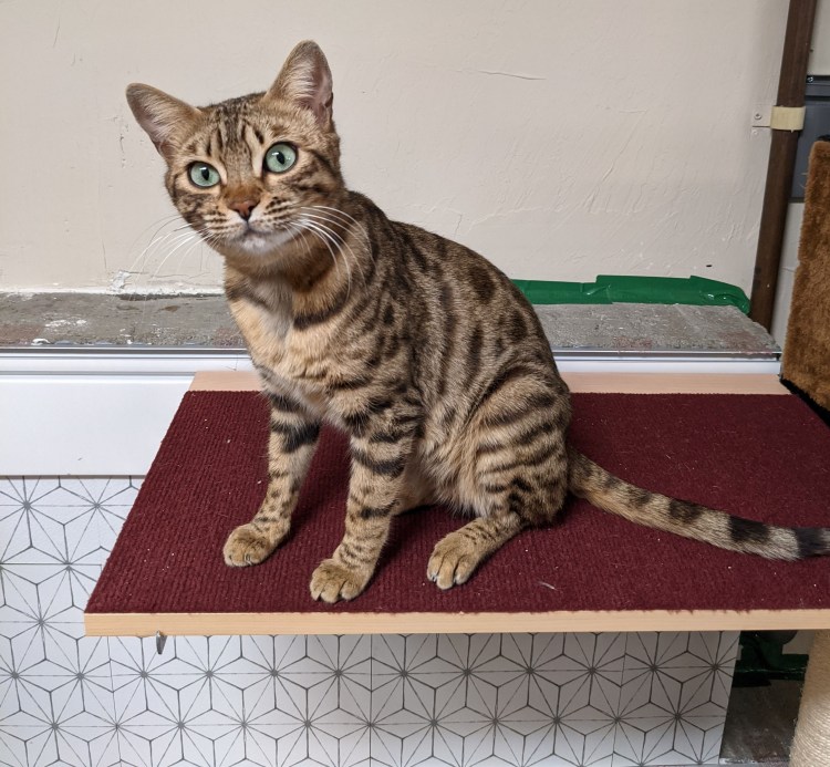 Lily would do best in a single-cat household. She has not lived with a dog, but we think that she could get used to one if proper introduction techniques are used. She is a very active cat, running often on her wheel. She can be wary of unknown humans at first, but quickly warms up with some pets. She is a pretty chatty cat and has a ton of different vocalizations – always in a rather sing-songy type voice!