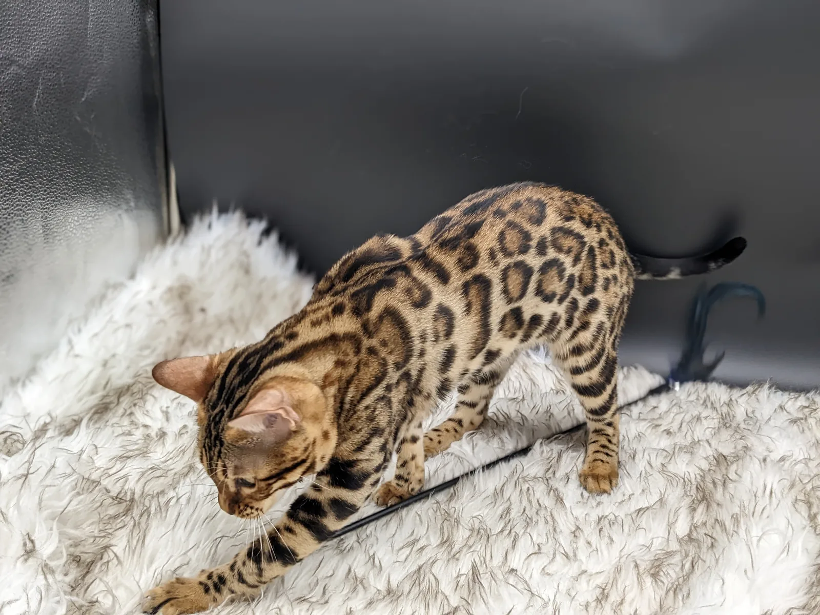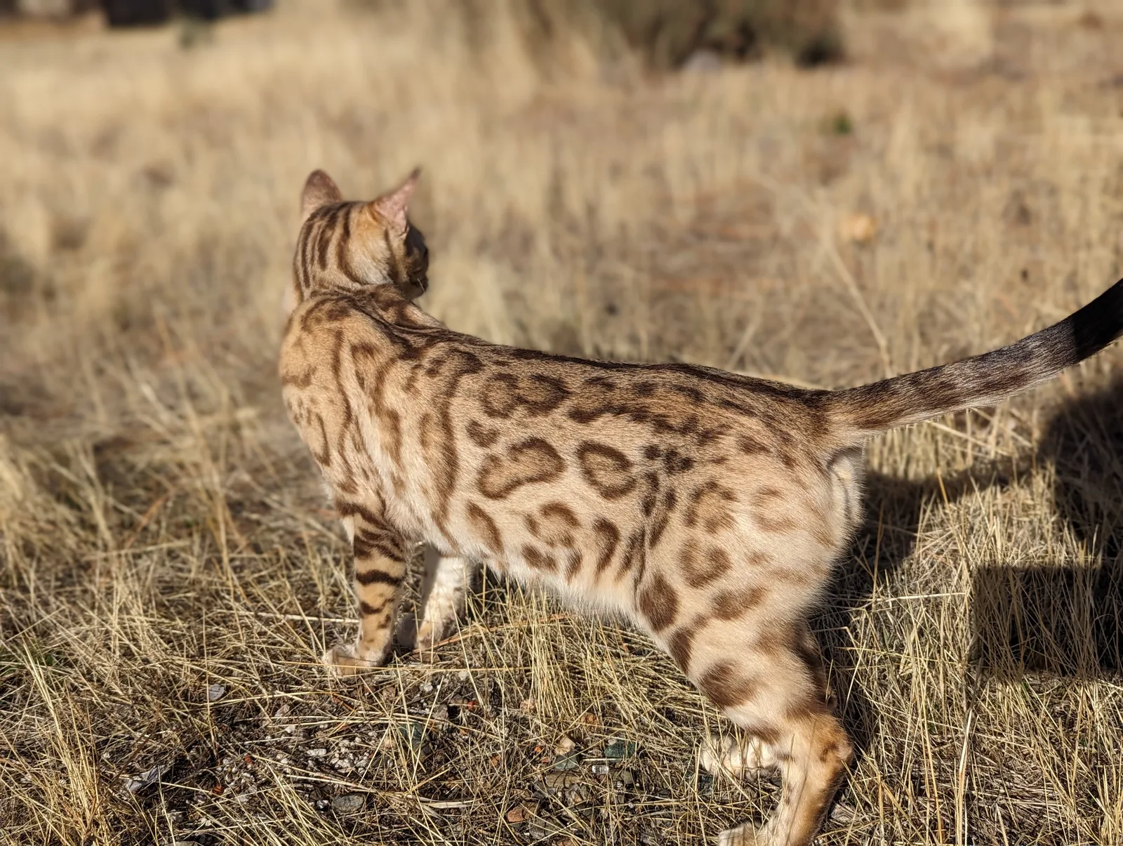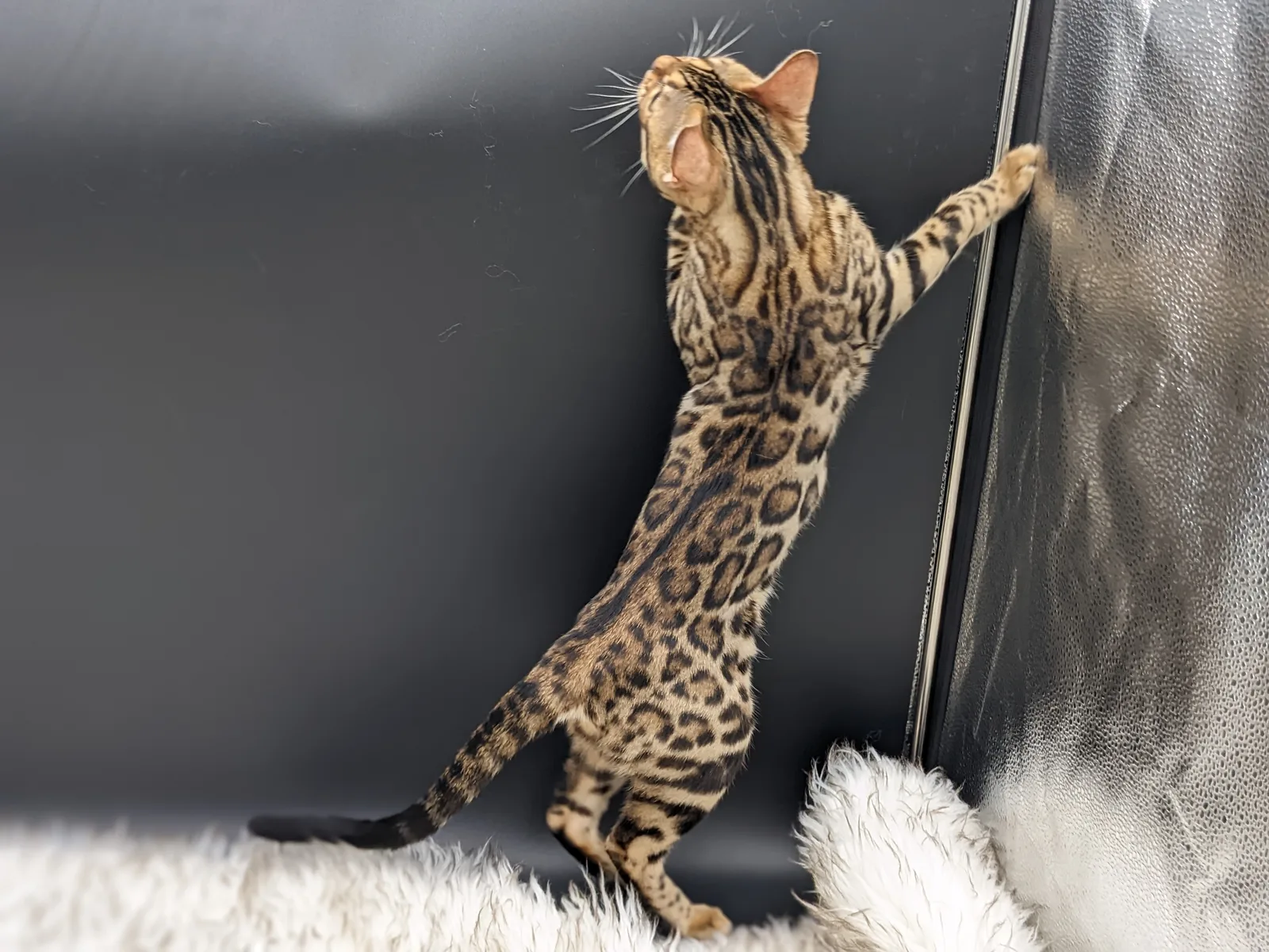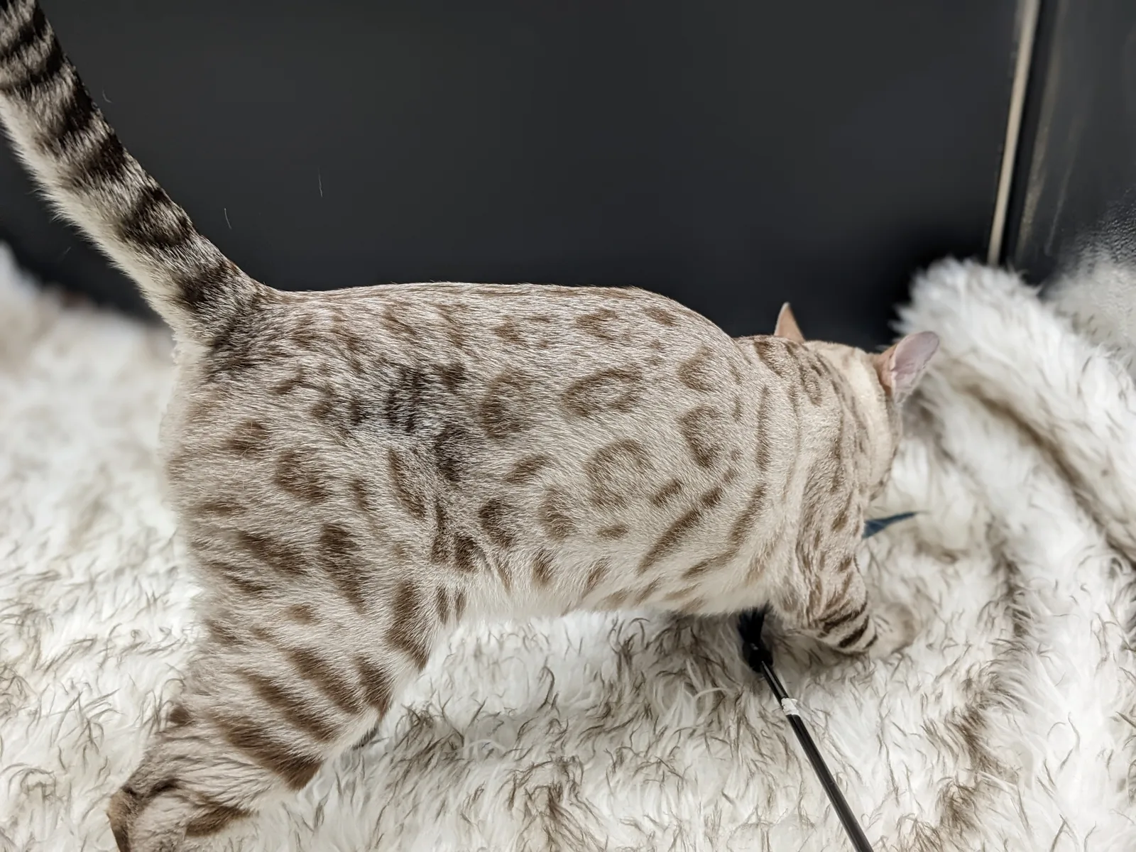 Her physical conformation — what breeders call "type" — isn't her strongest suit, and we're candid that selecting for color ahead of type isn't the conventional approach in Bengal breeding. But when paired with a boy who carries strong type, her kittens should show an improvement over her own. And her temperament made the decision easy — Razz is one of the most adaptable, gentle, and openly affectionate cats we've ever known, and that disposition is exactly what we want passing to her kittens.