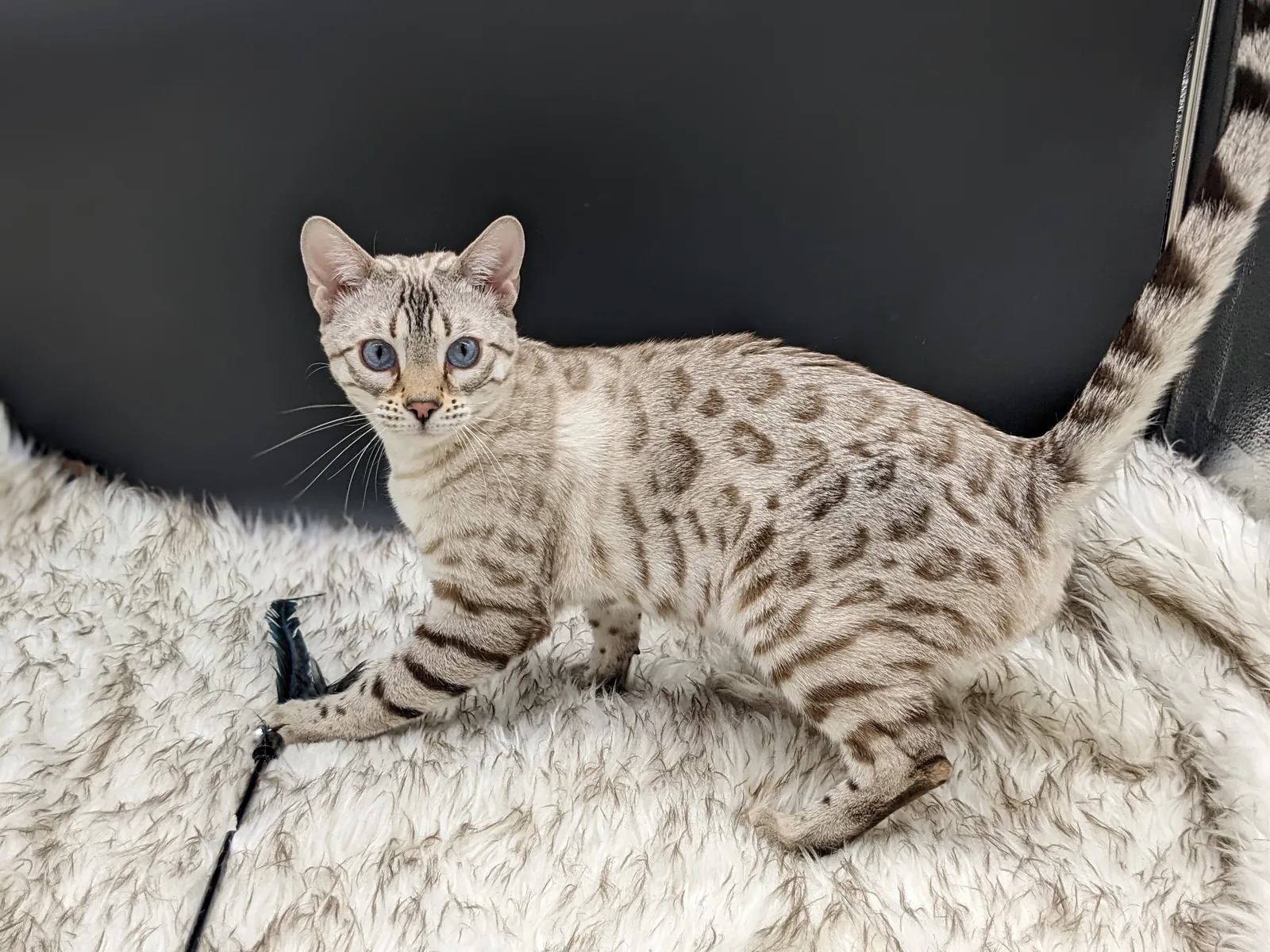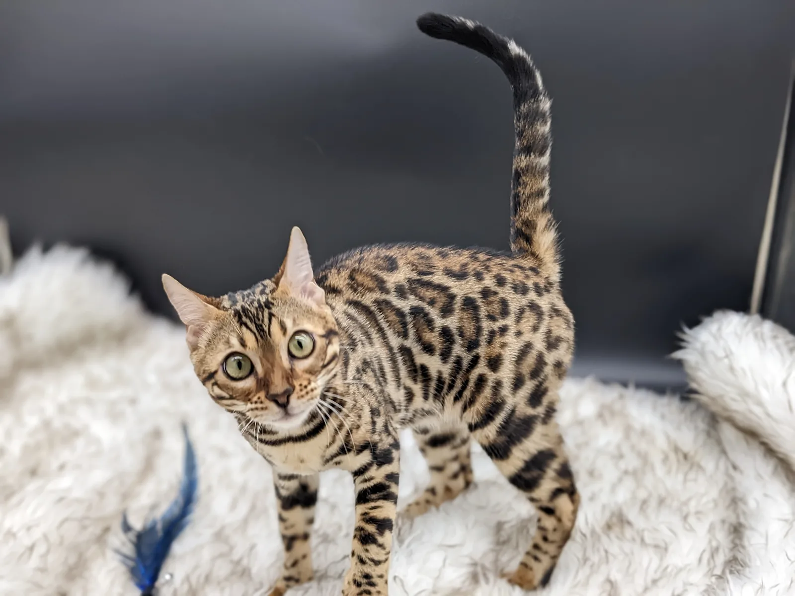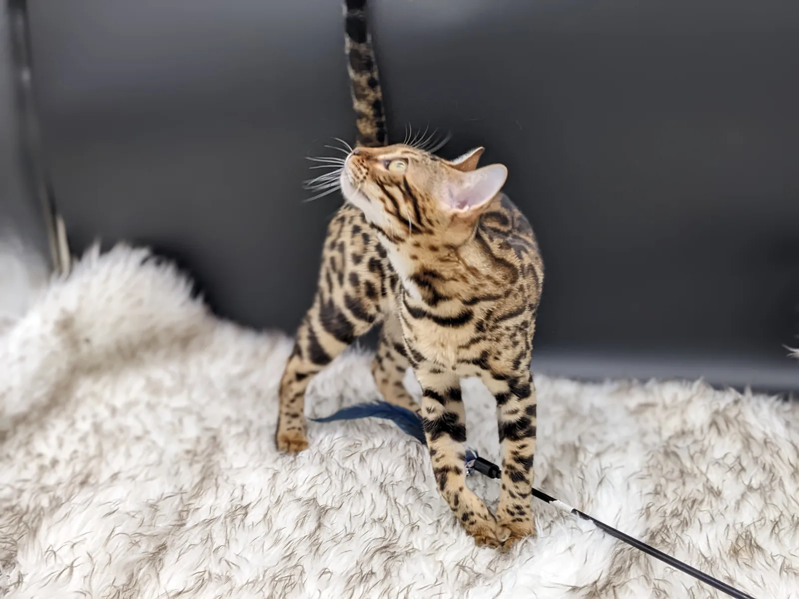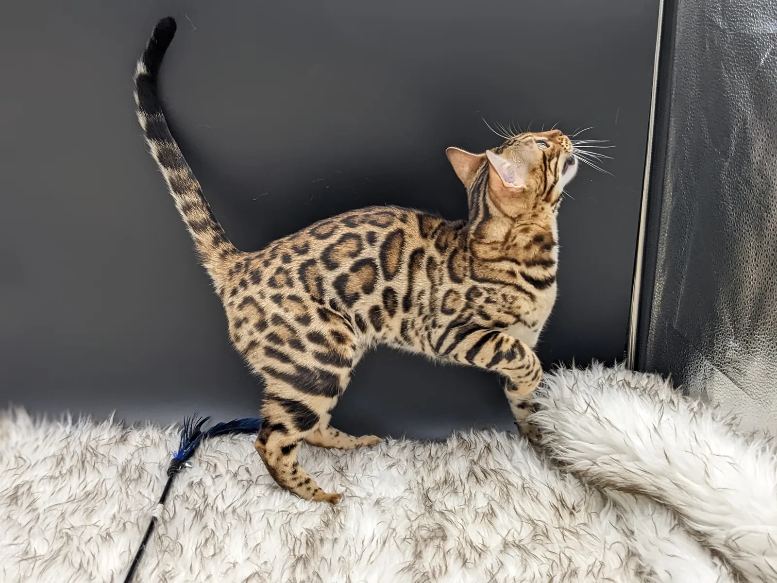 Her physical conformation — what breeders call "type" — isn't her strongest suit, and we're candid that selecting for color ahead of type isn't the conventional approach in Bengal breeding. But when paired with a boy who carries strong type, her kittens should show an improvement over her own. And her temperament made the decision easy — Razz is one of the most adaptable, gentle, and openly affectionate cats we've ever known, and that disposition is exactly what we want passing to her kittens.