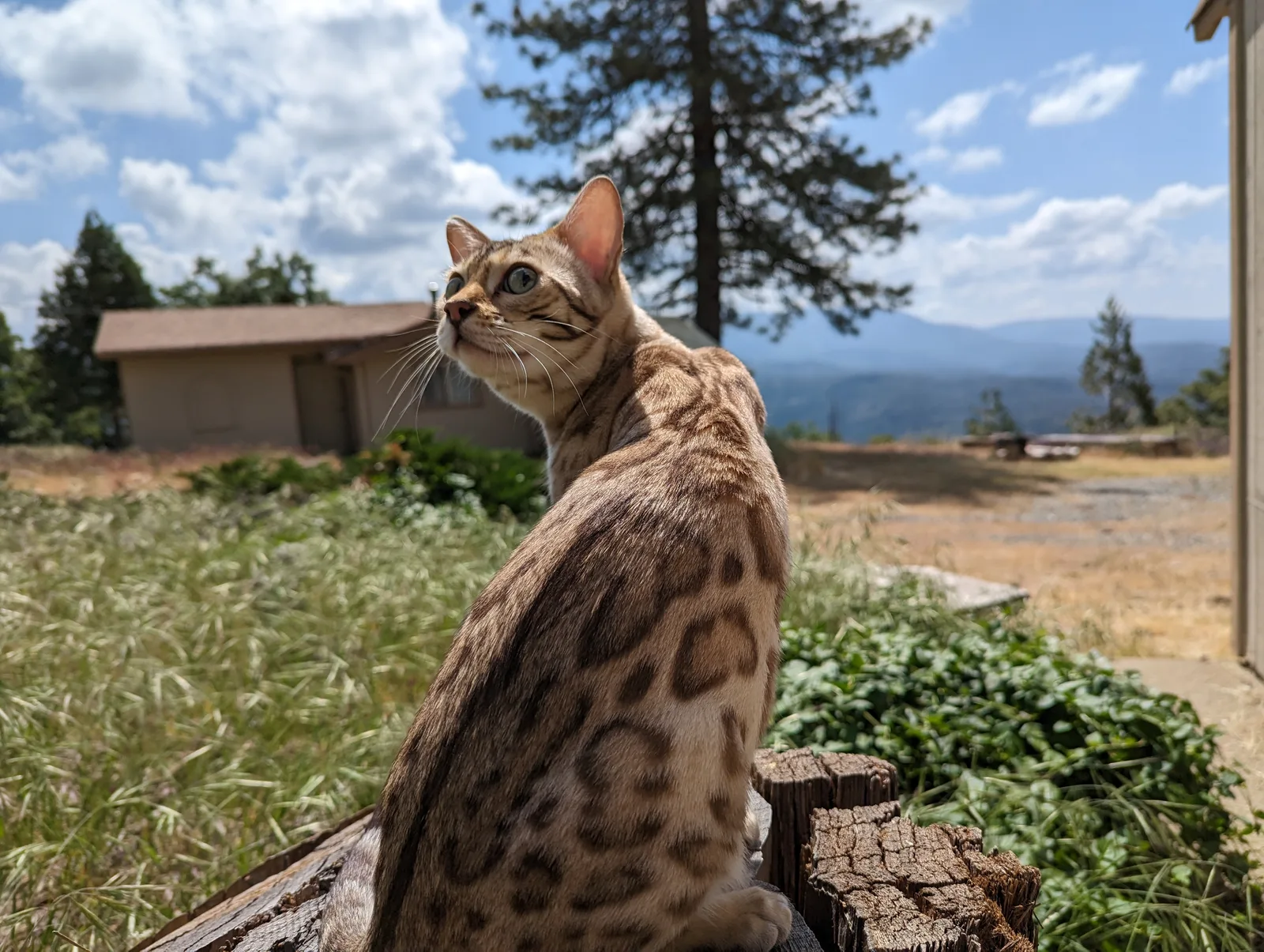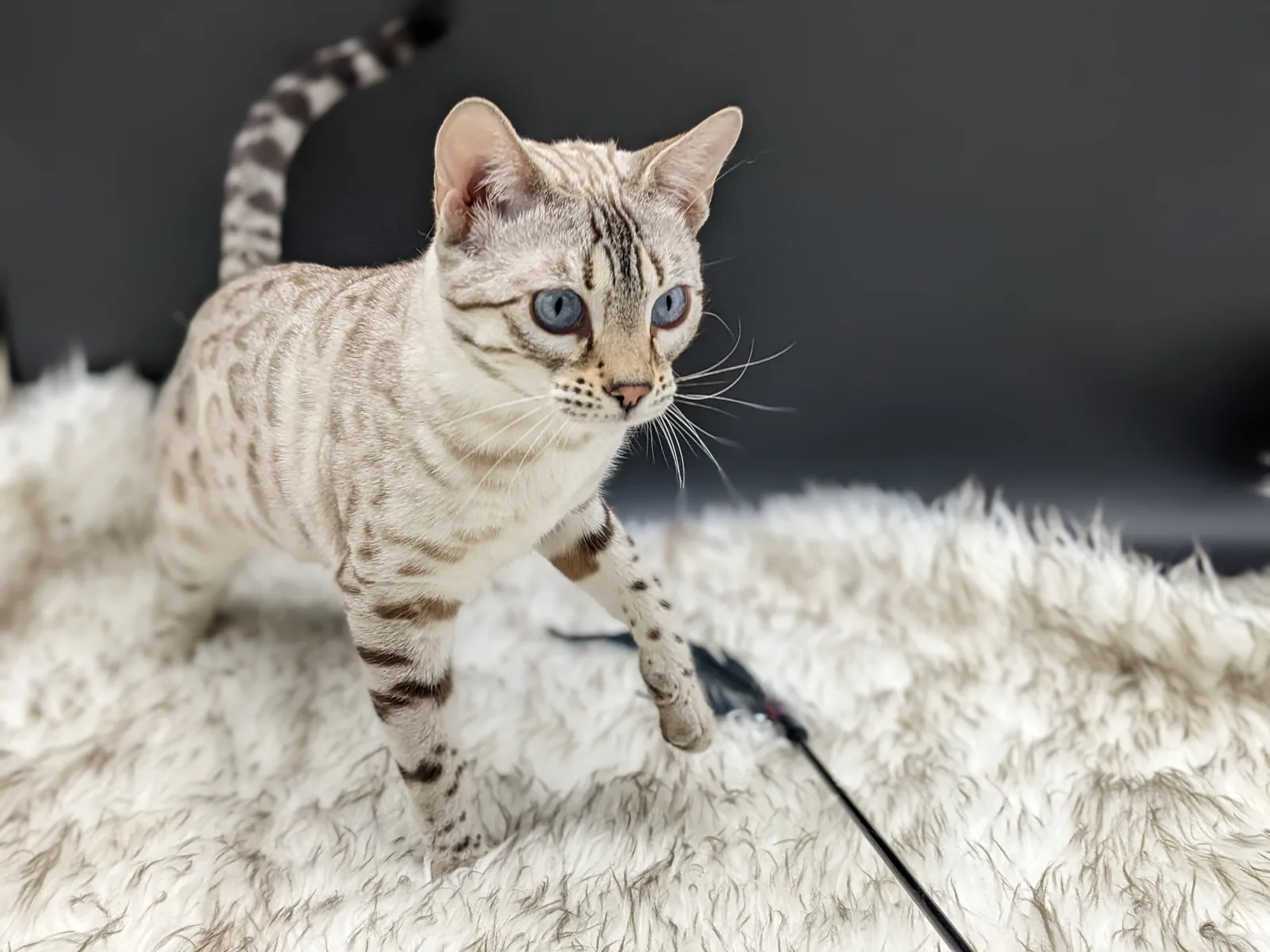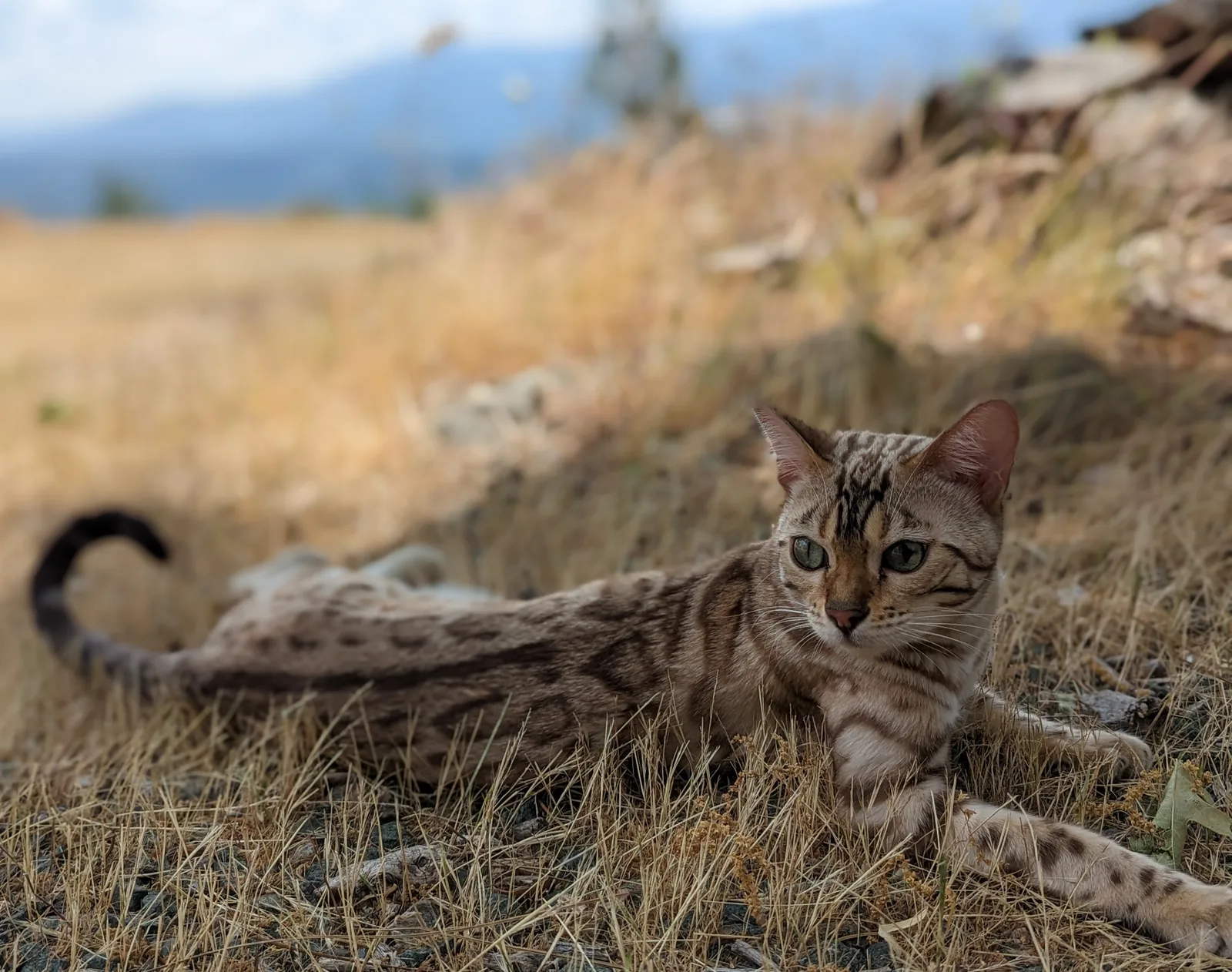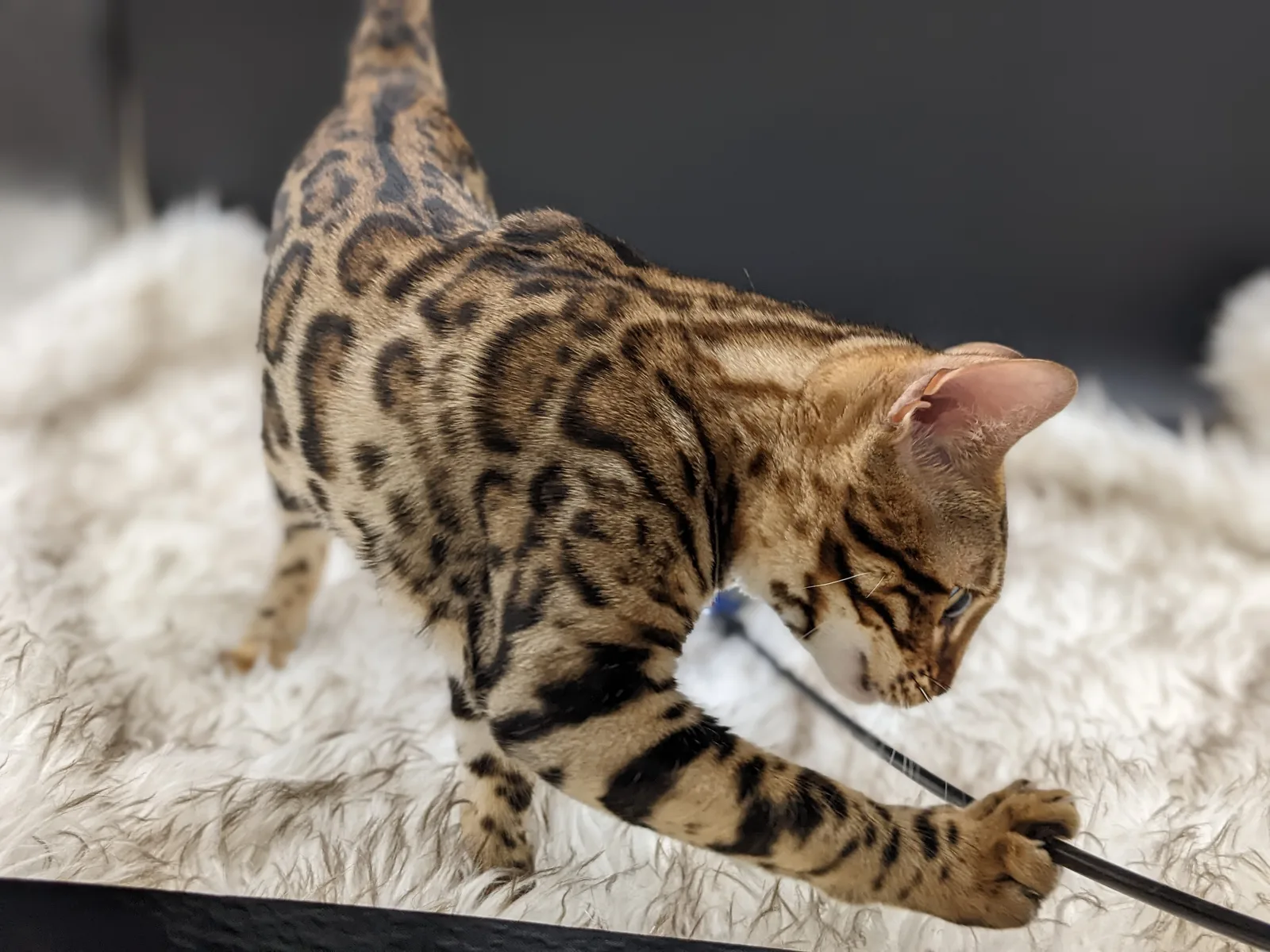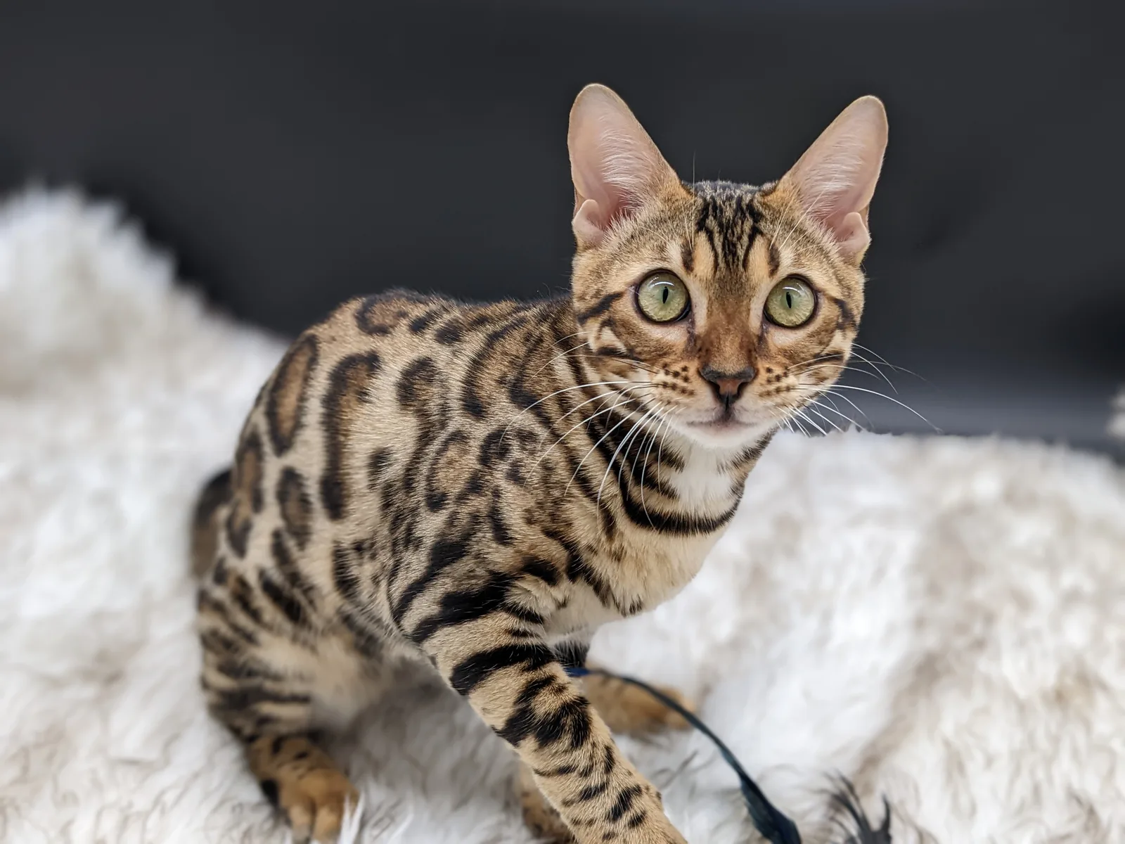 Her physical conformation — what breeders call "type" — isn't her strongest suit, and we're candid that selecting for color ahead of type isn't the conventional approach in Bengal breeding. But when paired with a boy who carries strong type, her kittens should show an improvement over her own. And her temperament made the decision easy — Razz is one of the most adaptable, gentle, and openly affectionate cats we've ever known, and that disposition is exactly what we want passing to her kittens.
