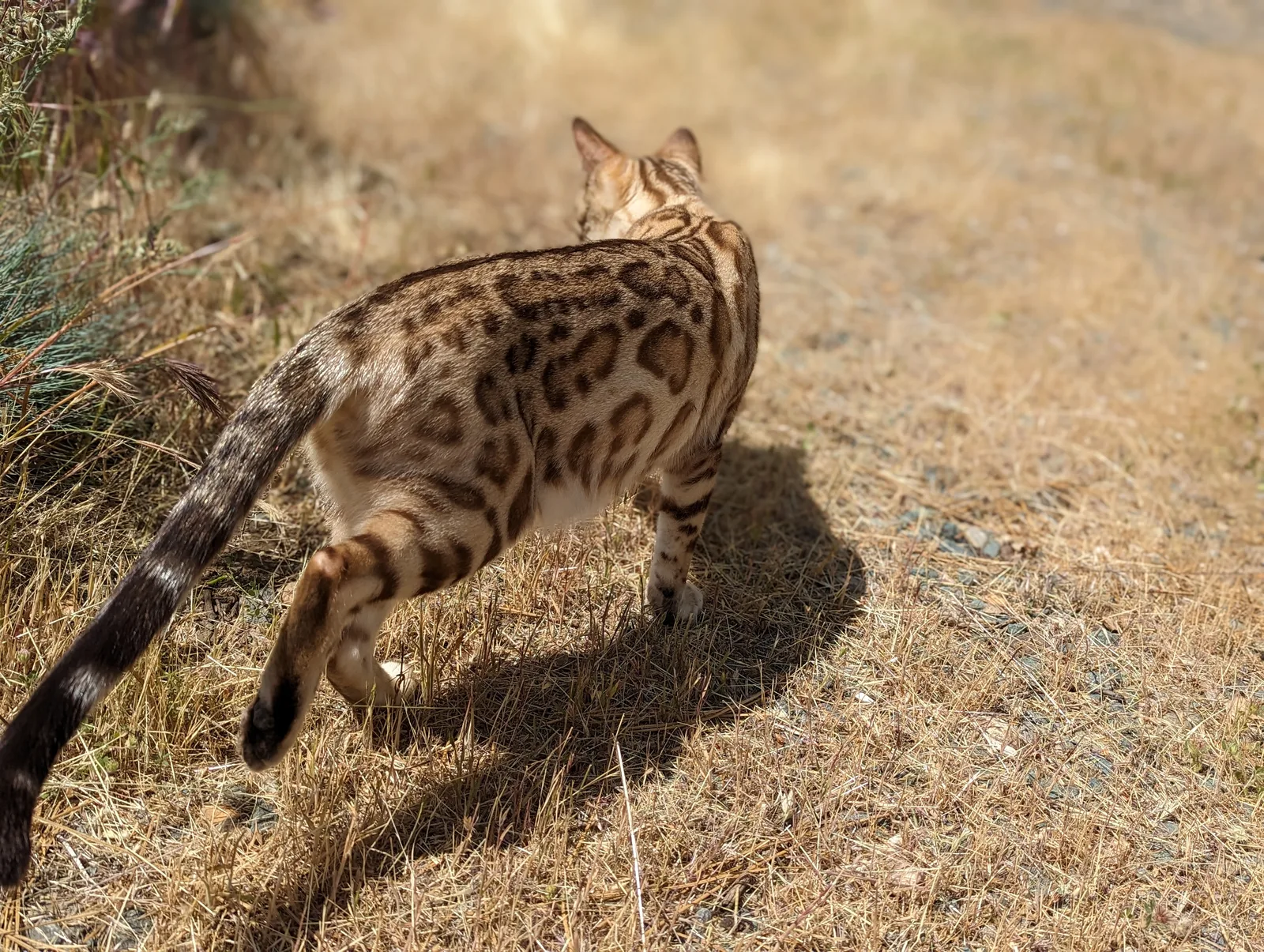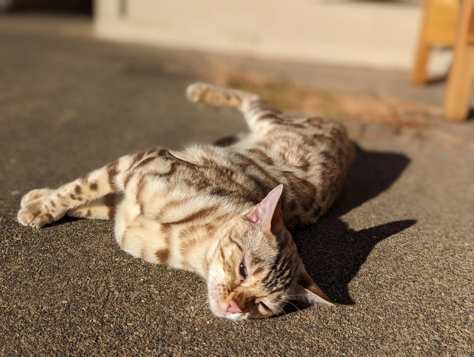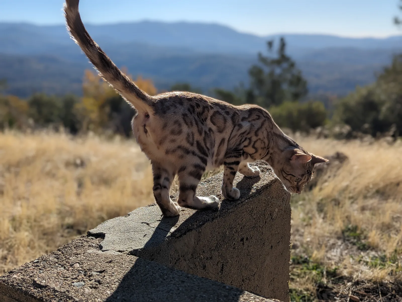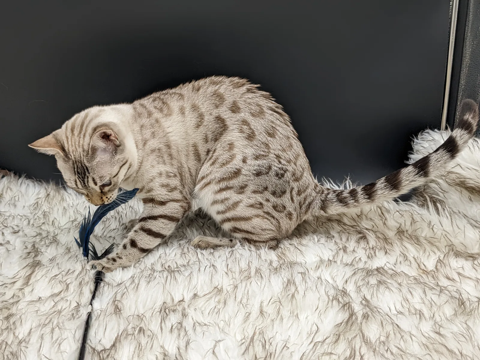 Her physical conformation — what breeders call "type" — isn't her strongest suit, and we're candid that selecting for color ahead of type isn't the conventional approach in Bengal breeding. But when paired with a boy who carries strong type, her kittens should show an improvement over her own. And her temperament made the decision easy — Razz is one of the most adaptable, gentle, and openly affectionate cats we've ever known, and that disposition is exactly what we want passing to her kittens.