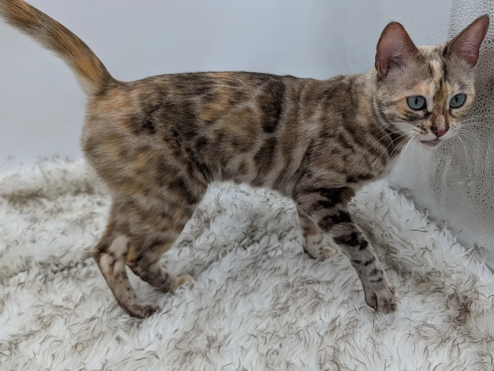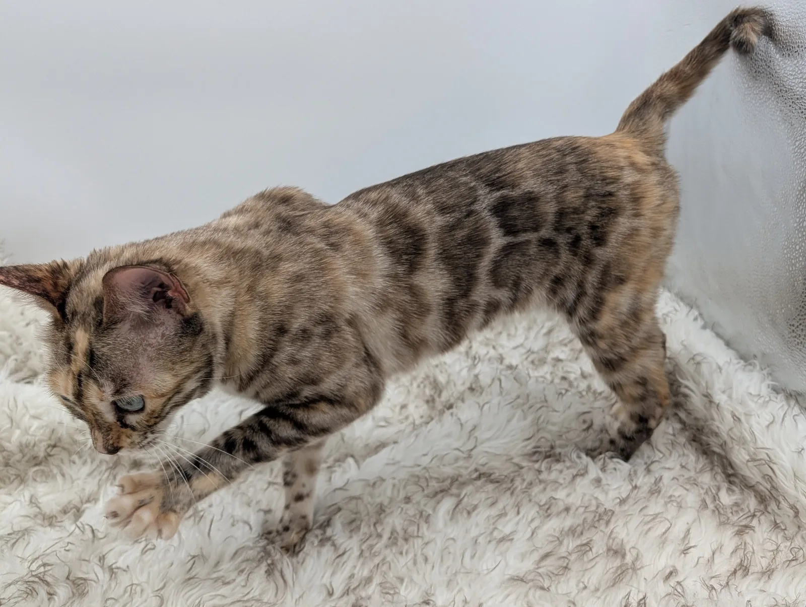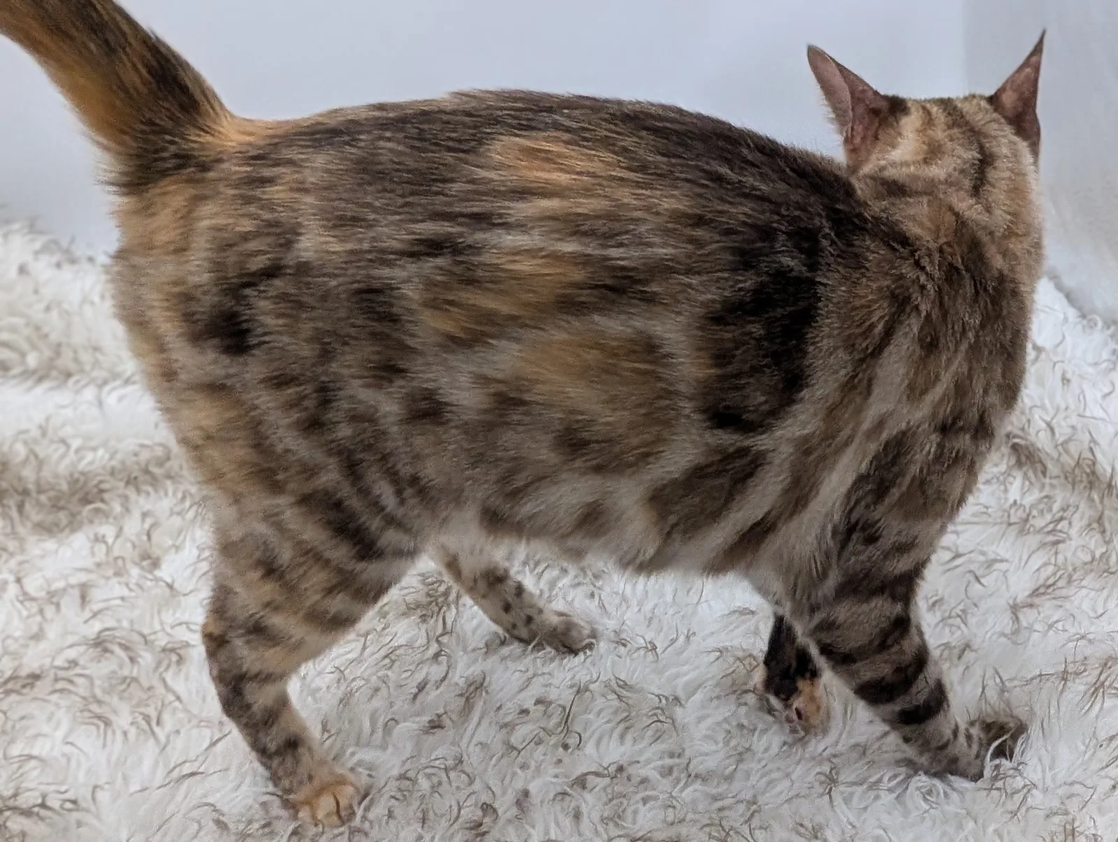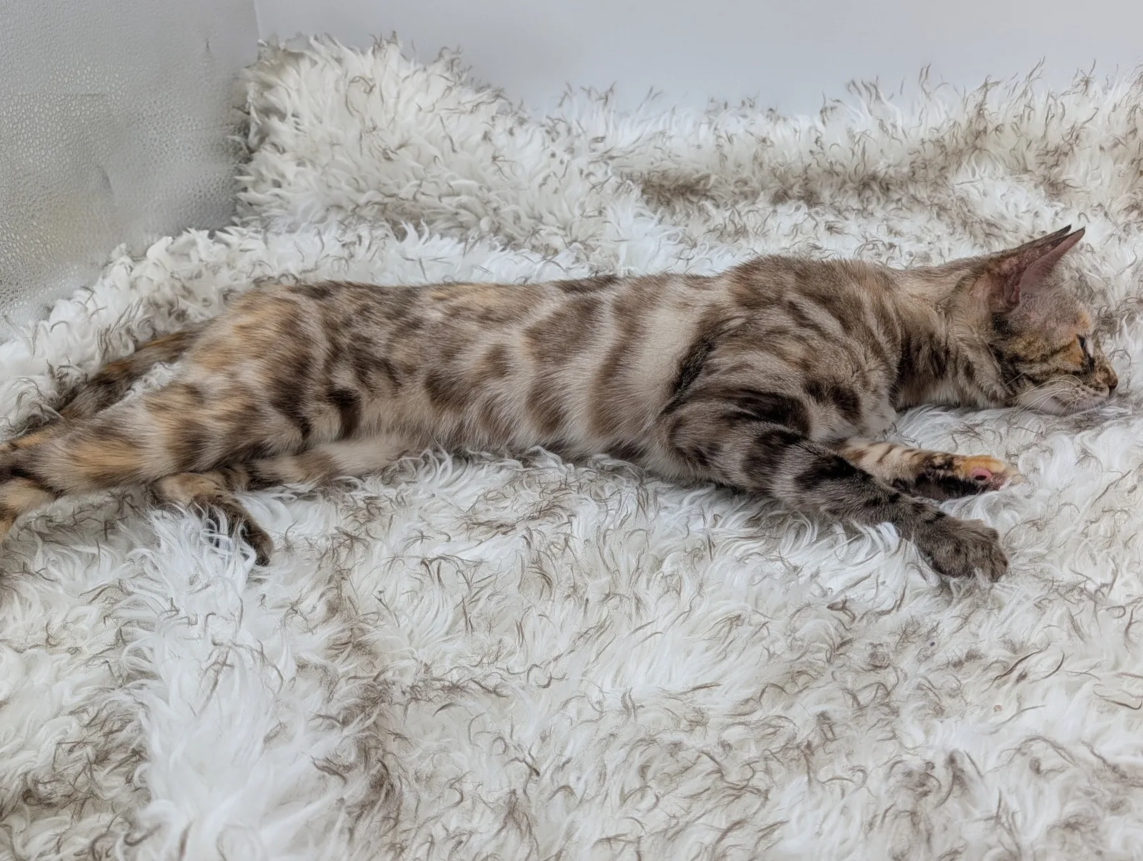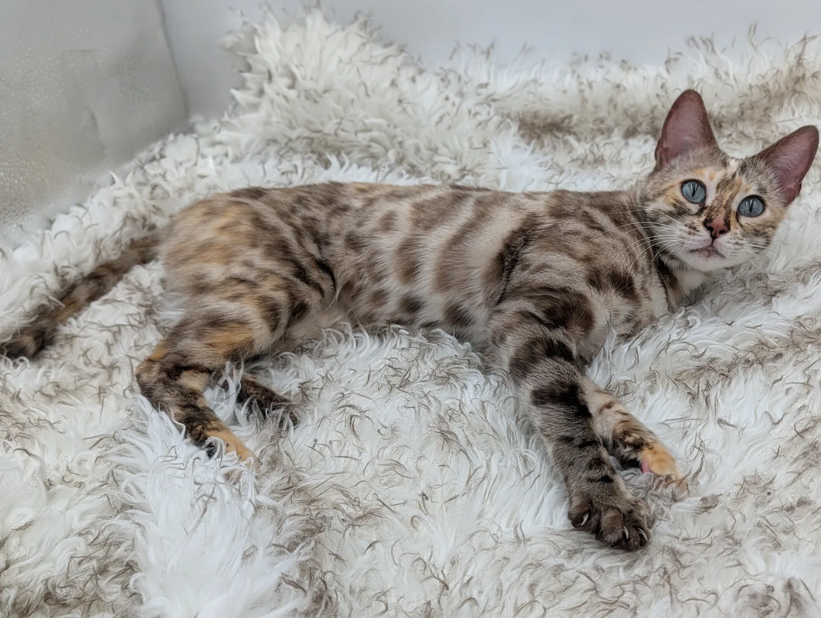 As a seal mink spotted torbie with glitter, she carries a truly exceptional color combination. Her warm mink tones, striking torbie patterning, and shimmering glitter coat are unlike anything else in our program — and what she brings genetically is just as exciting. Because Razz is homozygous for the leopard cat agouti gene (Apb/Apb), every kitten she has will carry it — and paired with CheeseTake, who carries the domestic non-agouti (a), charcoal-patterned kittens are possible in every litter. Between her 2 snow color genes (cs/cb) and CheeseTake's single color point (C/cs), kittens can come out brown, seal mink, or seal lynx point, with girls as torbies and boys potentially red.