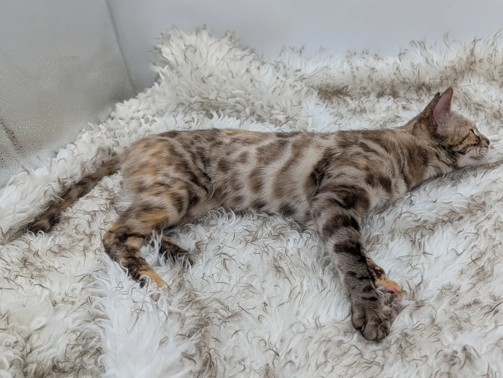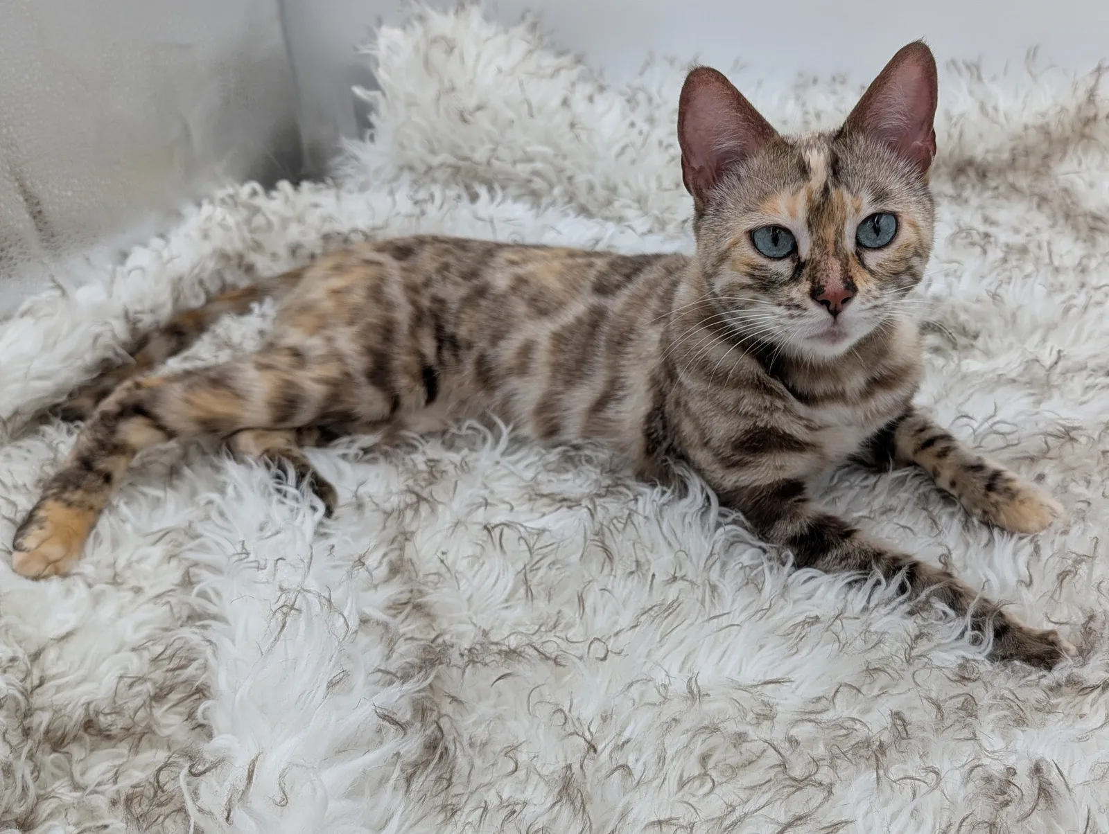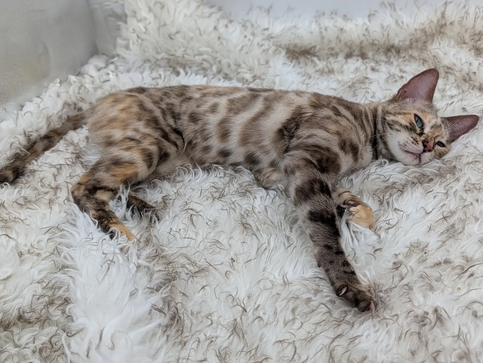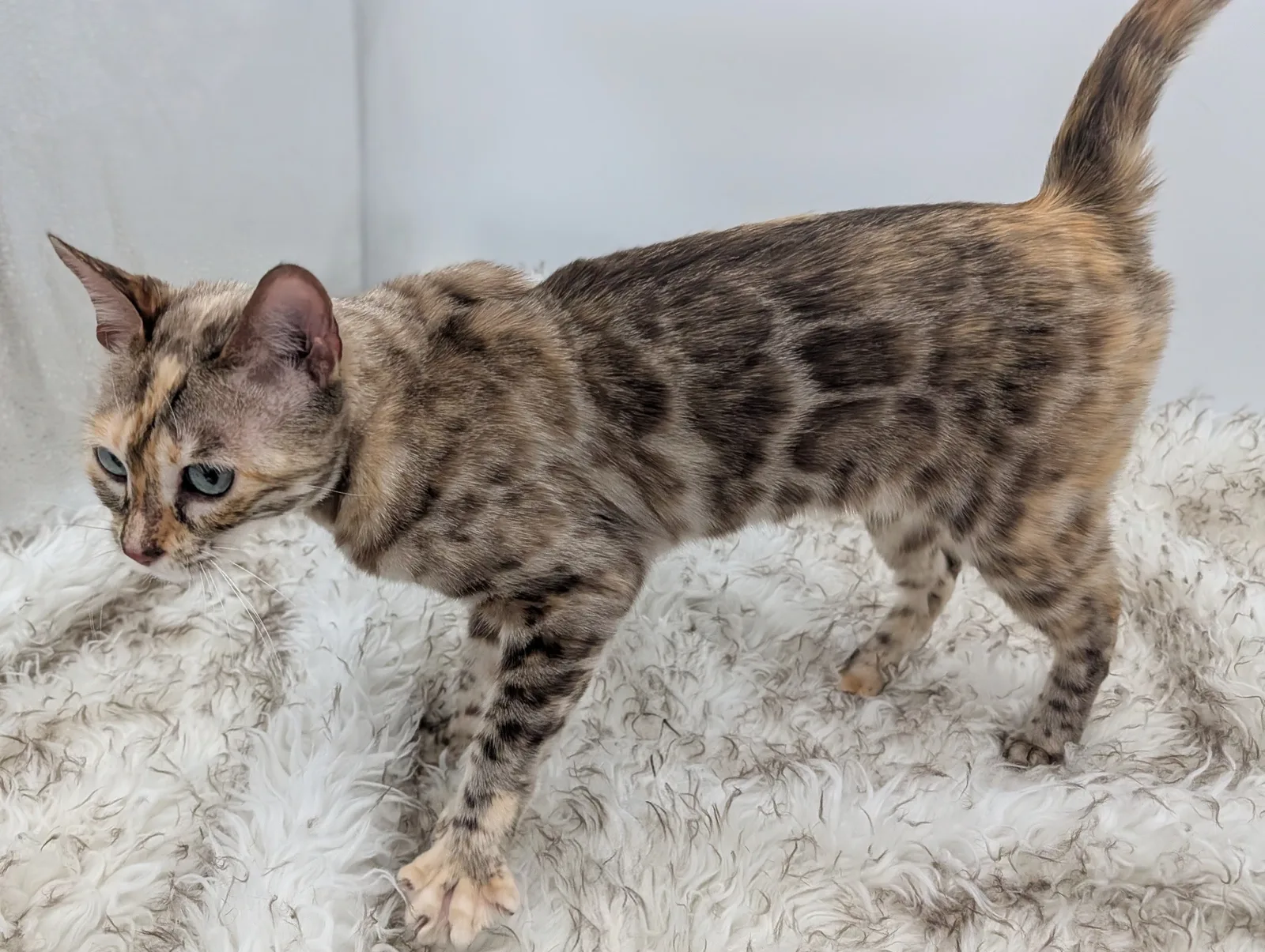 As a seal mink spotted torbie with glitter, she carries a truly exceptional color combination. Her warm mink tones, striking torbie patterning, and shimmering glitter coat are unlike anything else in our program — and what she brings genetically is just as exciting. Because Razz is homozygous for the leopard cat agouti gene (Apb/Apb), every kitten she has will carry it — and paired with CheeseTake, who carries the domestic non-agouti (a), charcoal-patterned kittens are possible in every litter. Between her 2 snow color genes (cs/cb) and CheeseTake's single color point (C/cs), kittens can come out brown, seal mink, or seal lynx point, with girls as torbies and boys potentially red.