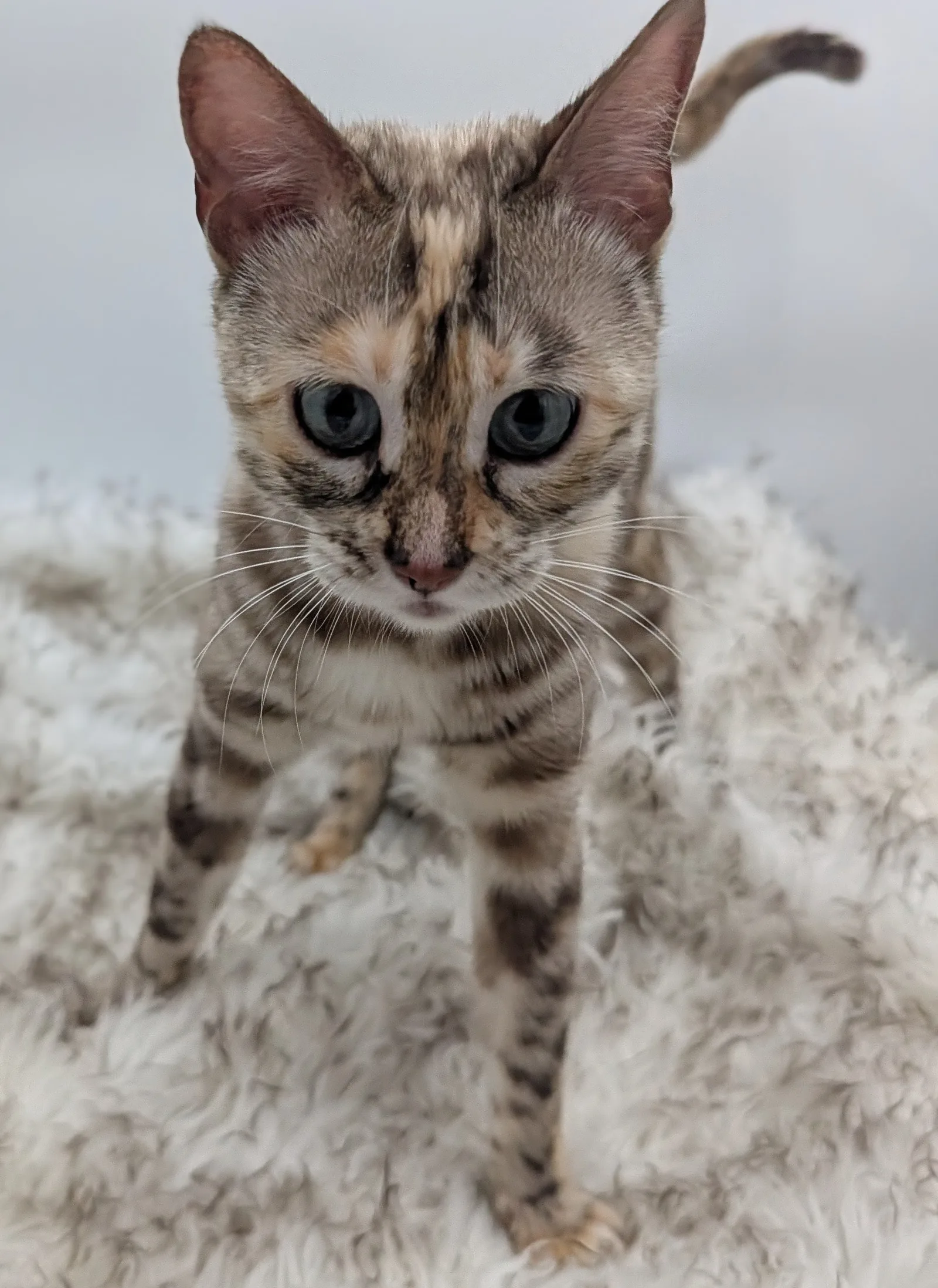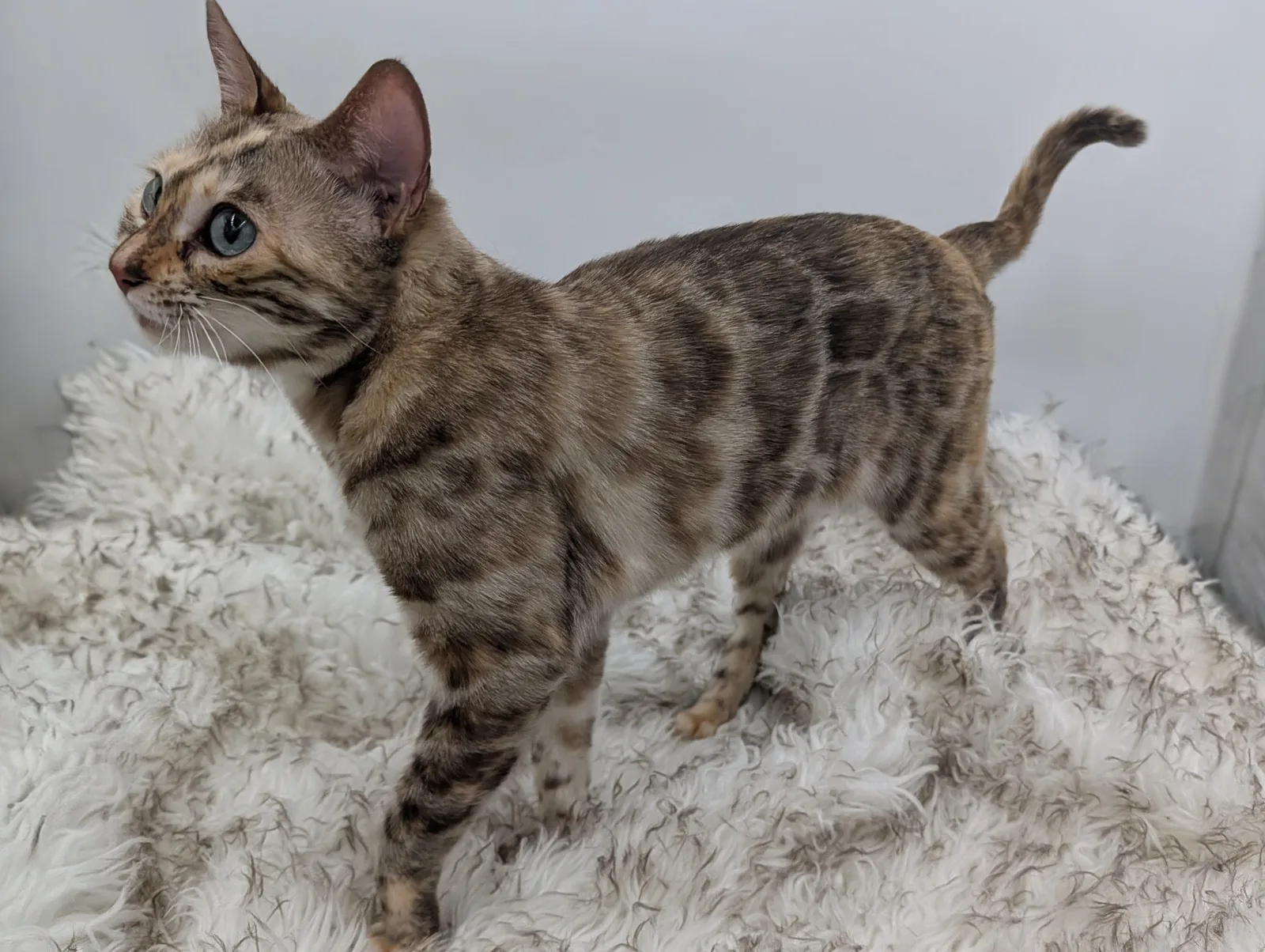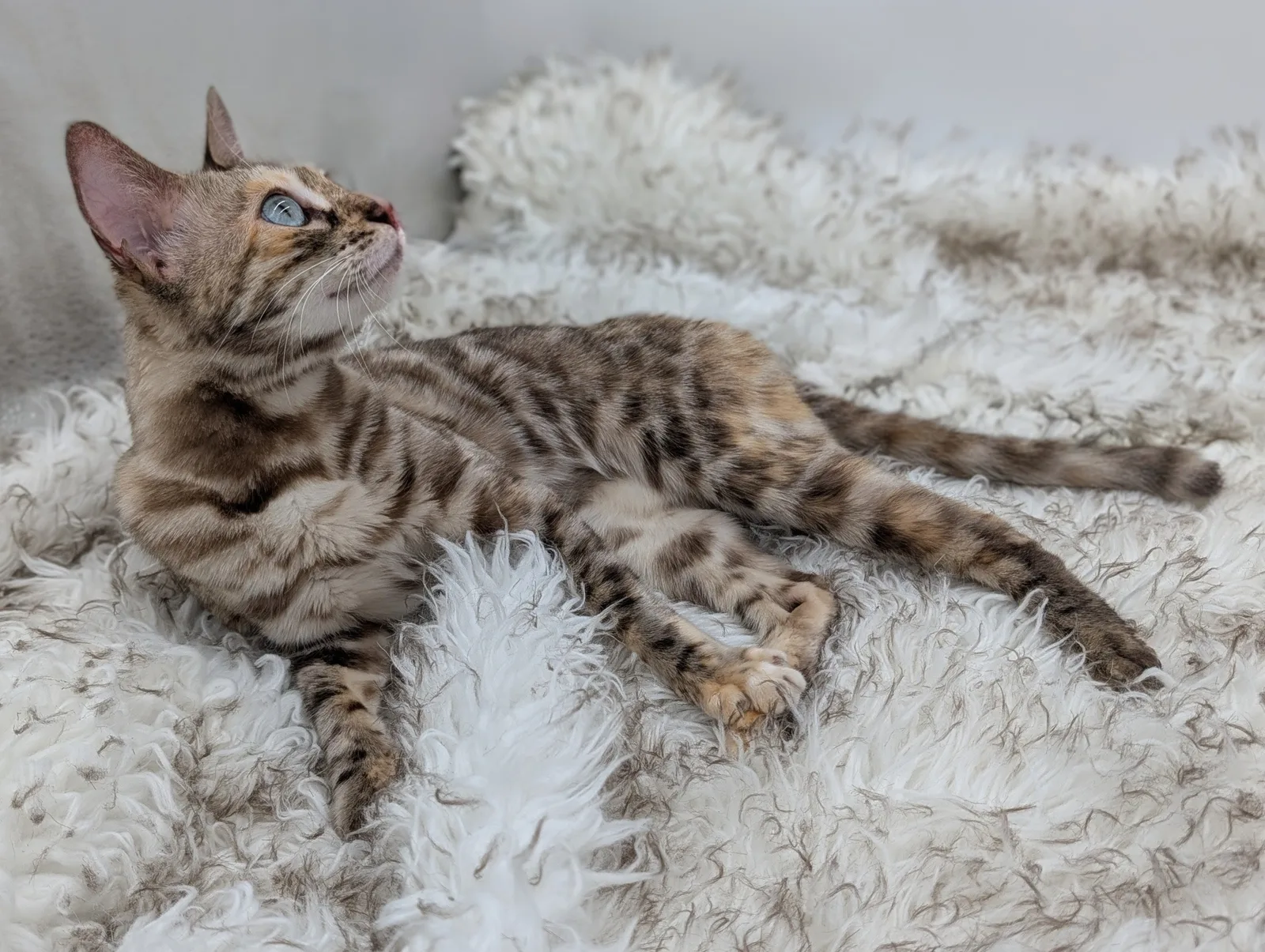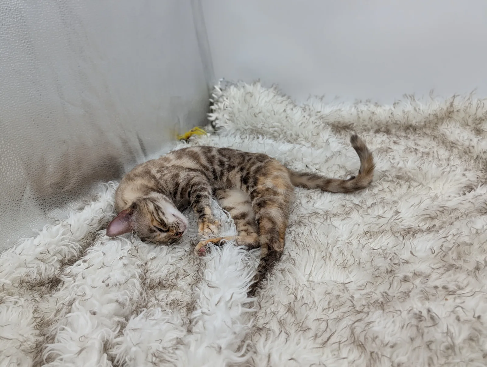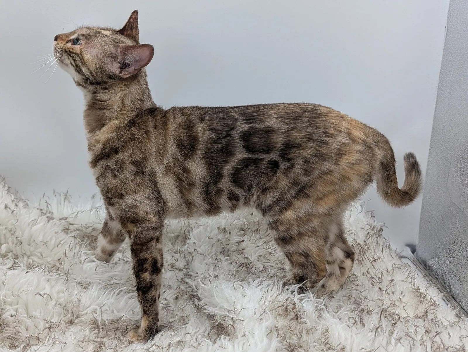 As a seal mink spotted torbie with glitter, she carries a truly exceptional color combination. Her warm mink tones, striking torbie patterning, and shimmering glitter coat are unlike anything else in our program — and what she brings genetically is just as exciting. Because Razz is homozygous for the leopard cat agouti gene (Apb/Apb), every kitten she has will carry it — and paired with CheeseTake, who carries the domestic non-agouti (a), charcoal-patterned kittens are possible in every litter. Between her 2 snow color genes (cs/cb) and CheeseTake's single color point (C/cs), kittens can come out brown, seal mink, or seal lynx point, with girls as torbies and boys potentially red.