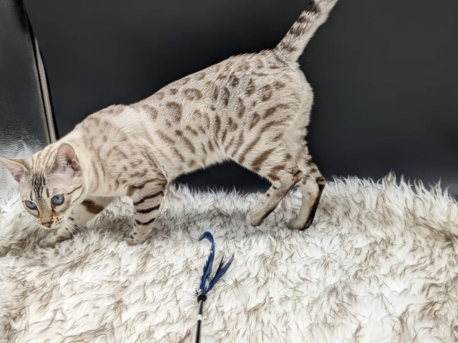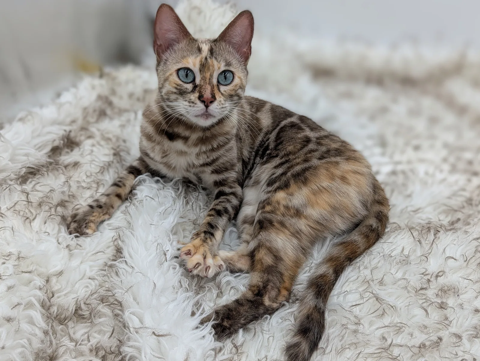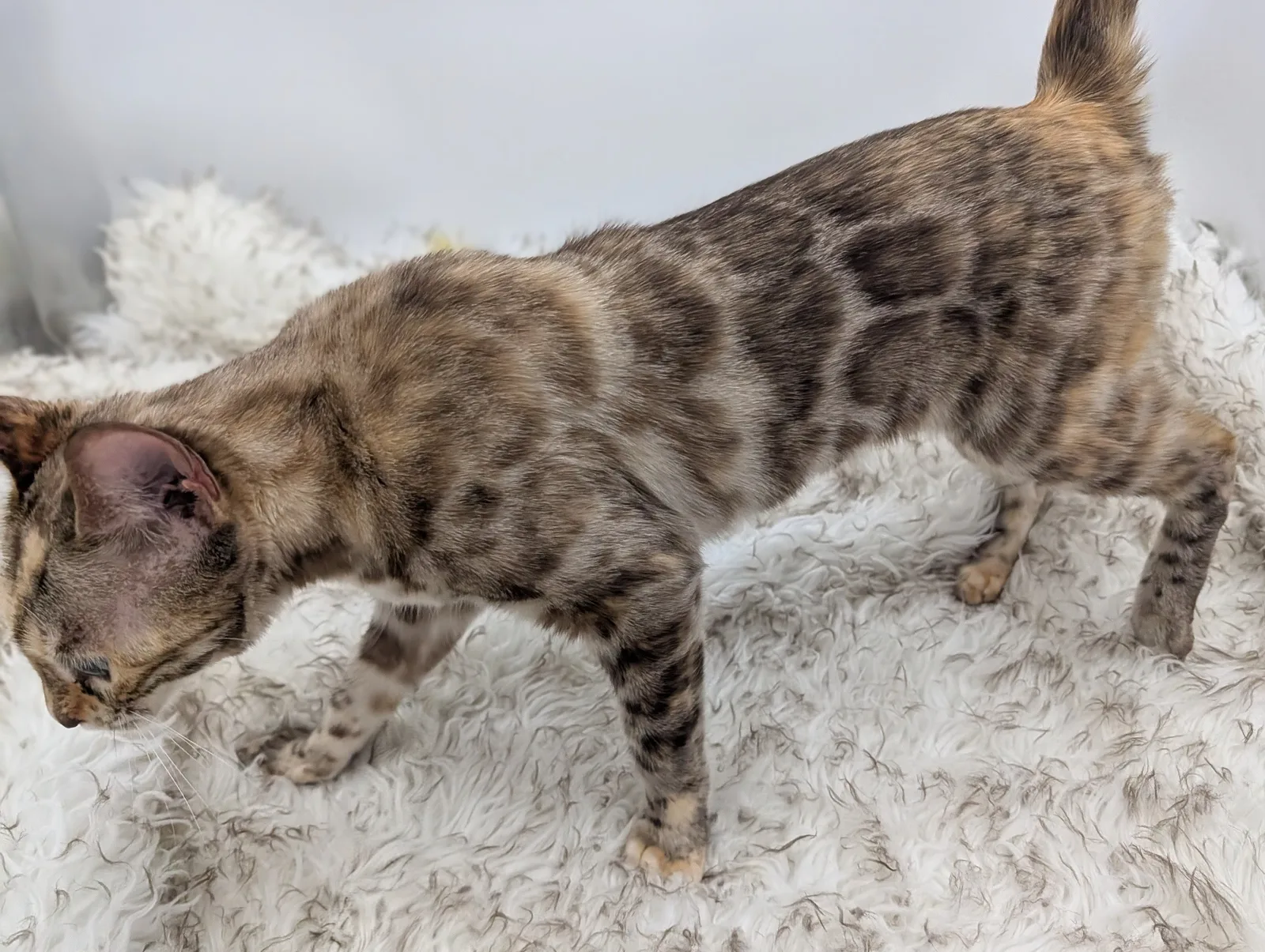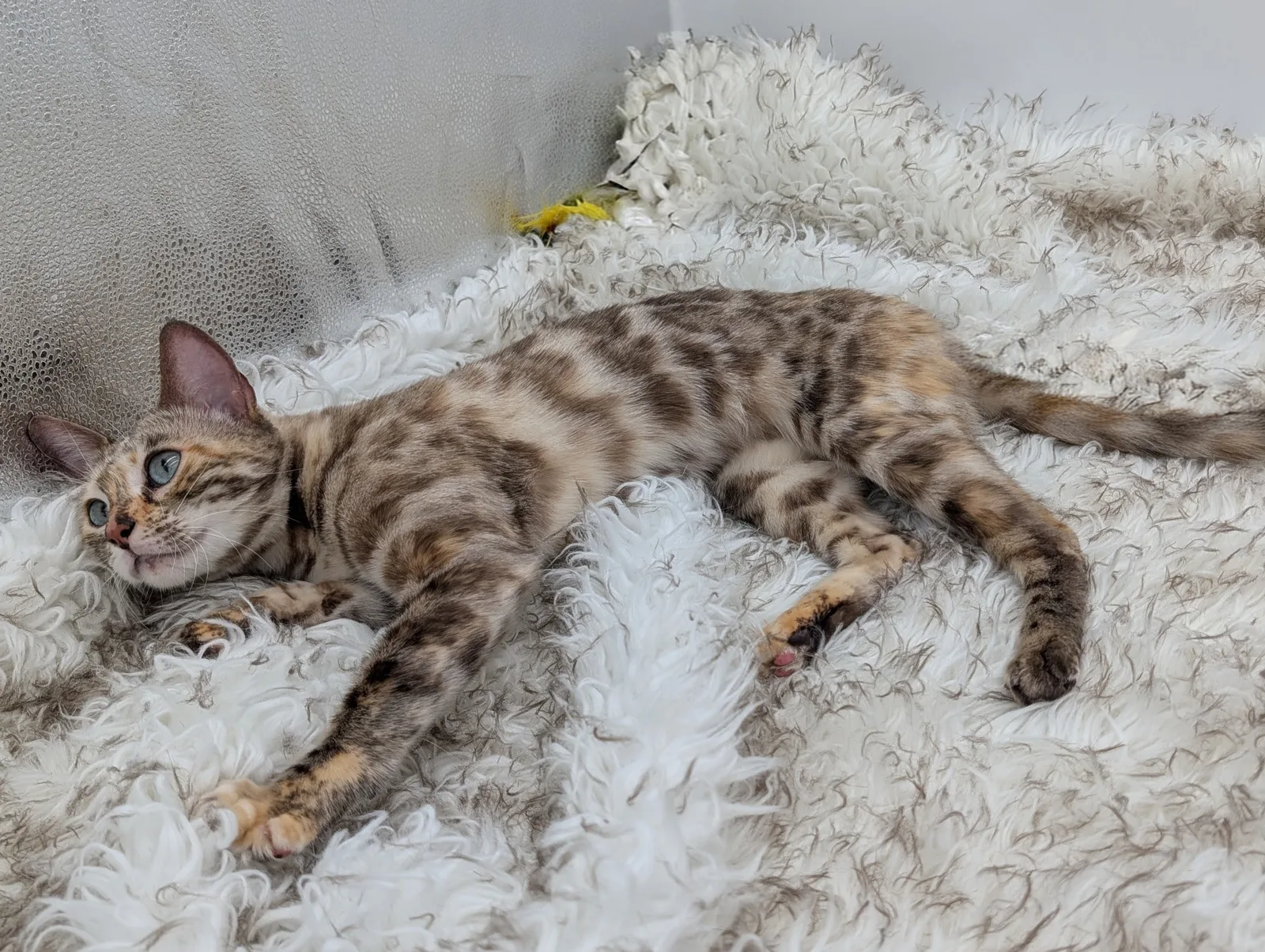 As a seal mink spotted torbie with glitter, she carries a truly exceptional color combination. Her warm mink tones, striking torbie patterning, and shimmering glitter coat are unlike anything else in our program — and what she brings genetically is just as exciting. Because Razz is homozygous for the leopard cat agouti gene (Apb/Apb), every kitten she has will carry it — and paired with CheeseTake, who carries the domestic non-agouti (a), charcoal-patterned kittens are possible in every litter. Between her 2 snow color genes (cs/cb) and CheeseTake's single color point (C/cs), kittens can come out brown, seal mink, or seal lynx point, with girls as torbies and boys potentially red.