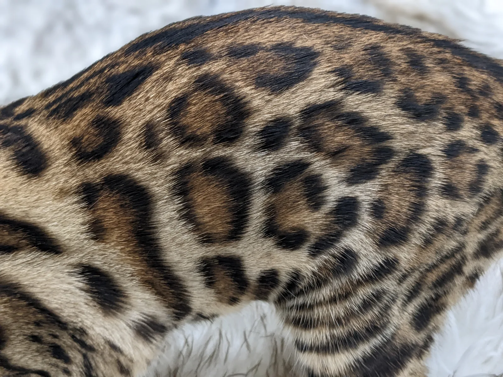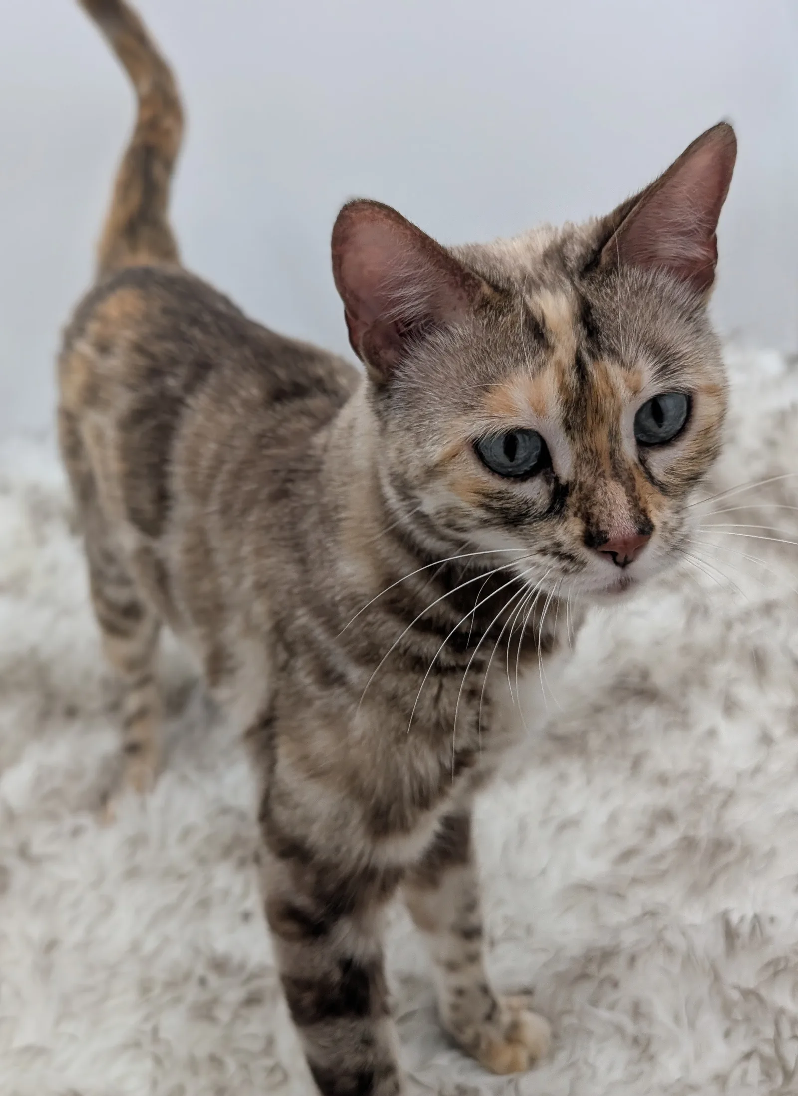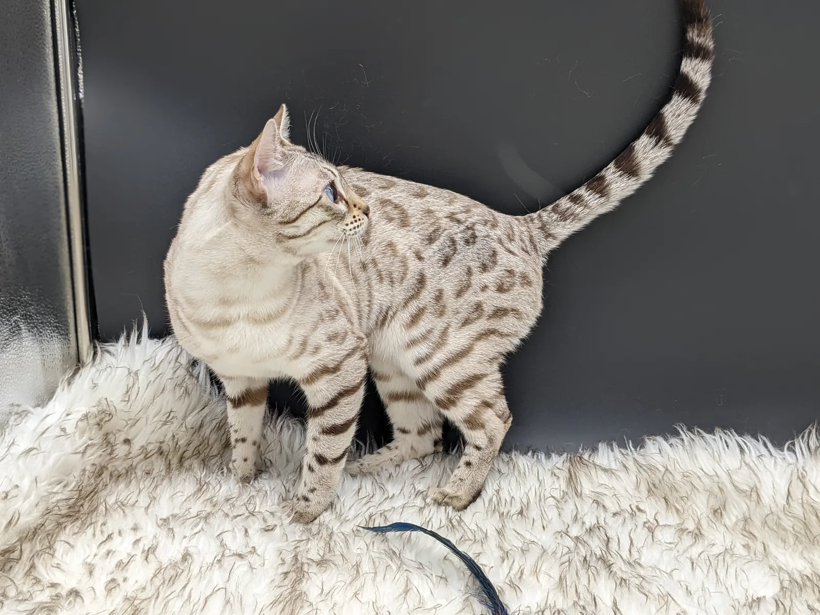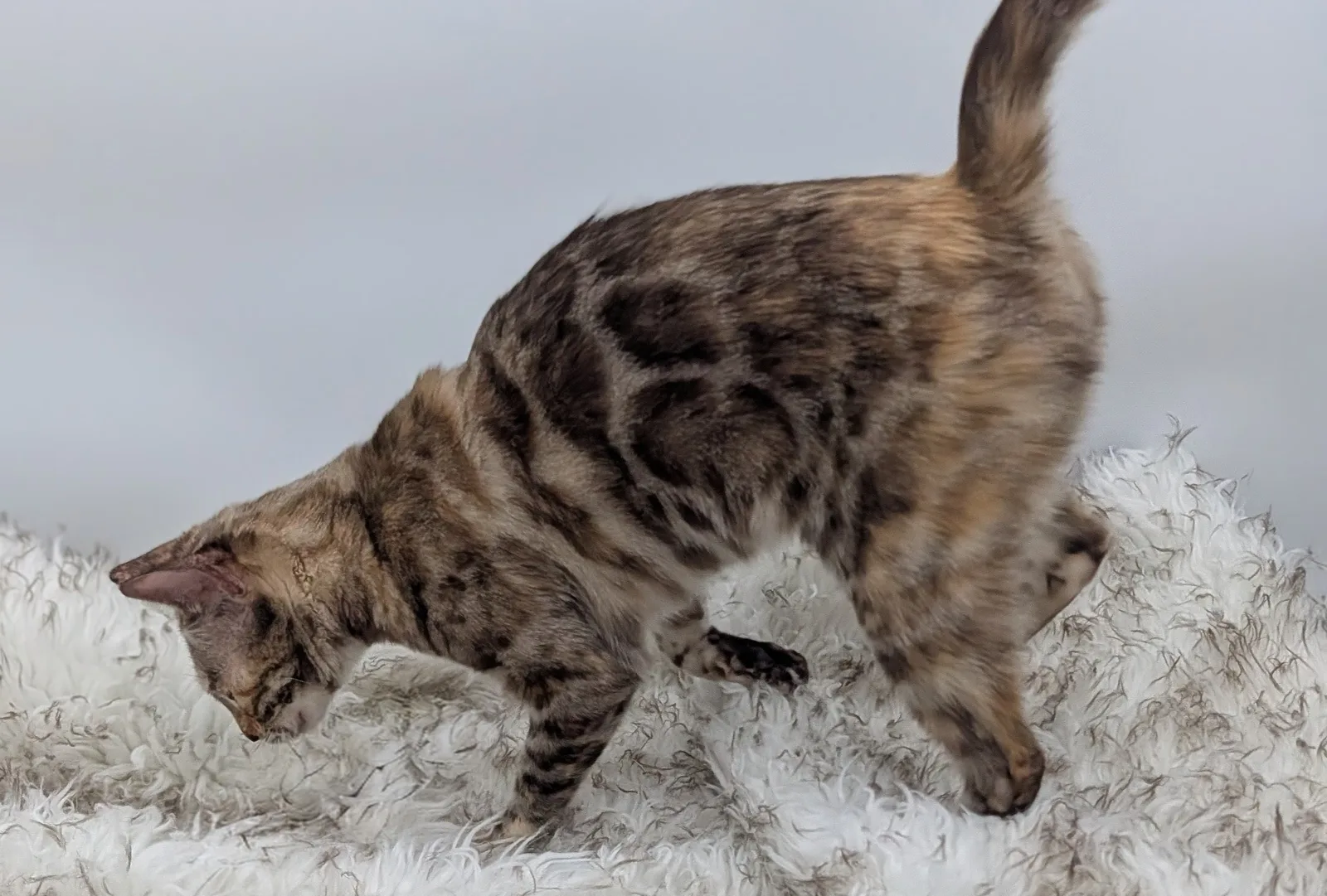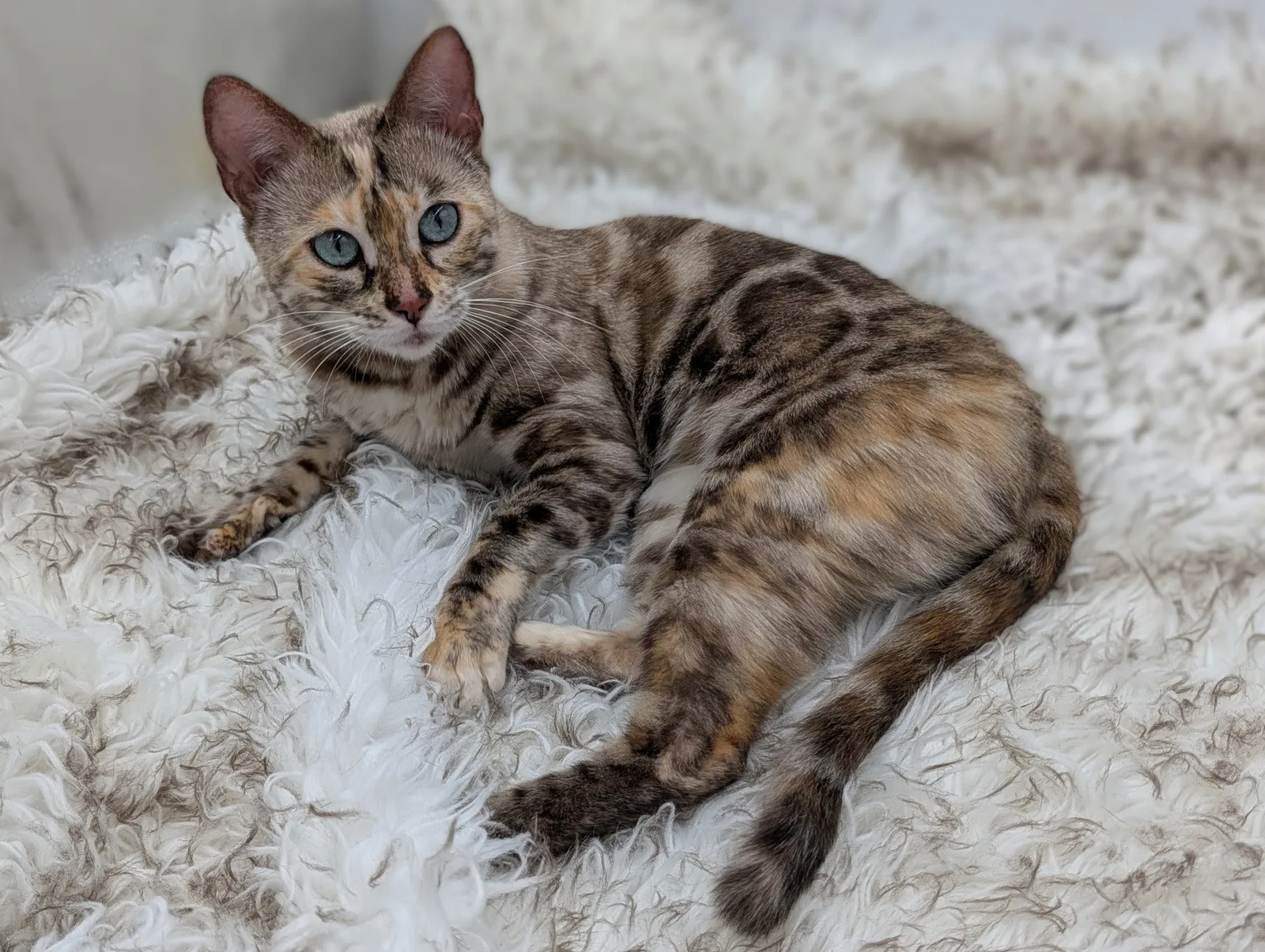 As a seal mink spotted torbie with glitter, she carries a truly exceptional color combination. Her warm mink tones, striking torbie patterning, and shimmering glitter coat are unlike anything else in our program — and what she brings genetically is just as exciting. Because Razz is homozygous for the leopard cat agouti gene (Apb/Apb), every kitten she has will carry it — and paired with CheeseTake, who carries the domestic non-agouti (a), charcoal-patterned kittens are possible in every litter. Between her 2 snow color genes (cs/cb) and CheeseTake's single color point (C/cs), kittens can come out brown, seal mink, or seal lynx point, with girls as torbies and boys potentially red.