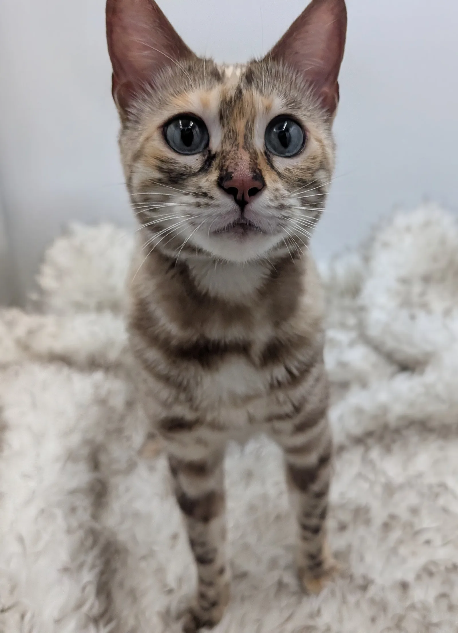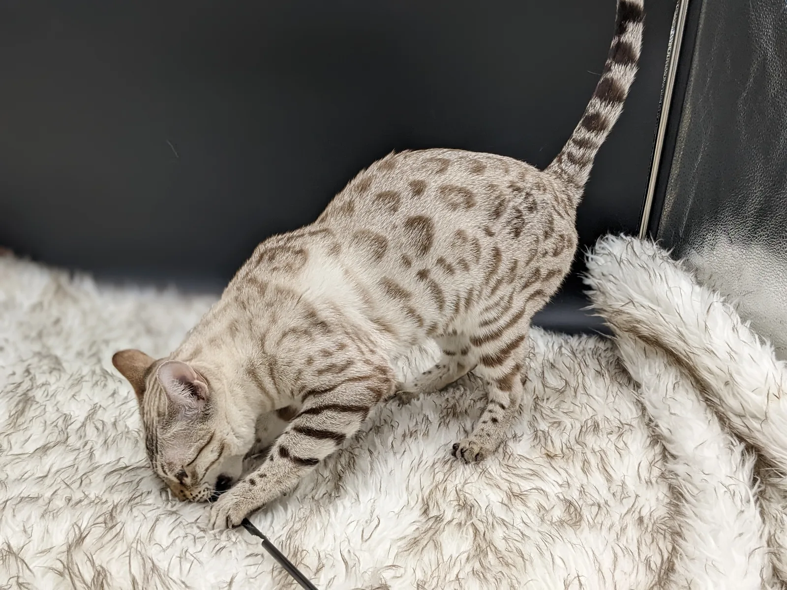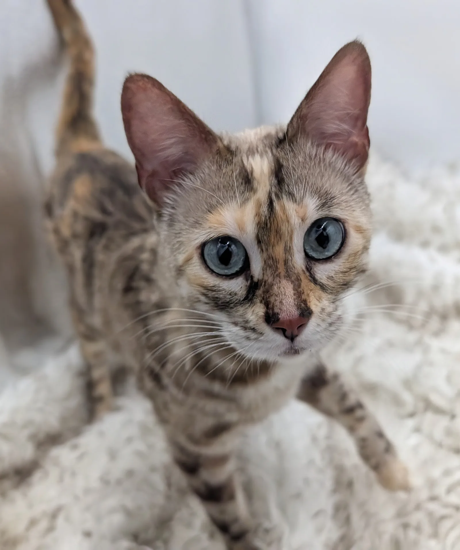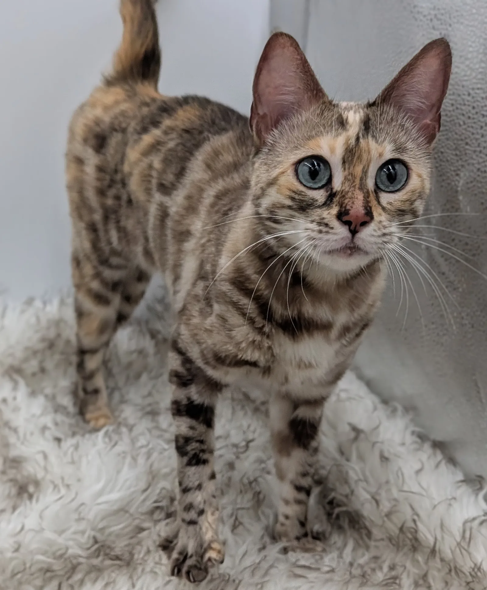 As a seal mink spotted torbie with glitter, she carries a truly exceptional color combination. Her warm mink tones, striking torbie patterning, and shimmering glitter coat are unlike anything else in our program — and what she brings genetically is just as exciting. Because Razz is homozygous for the leopard cat agouti gene (Apb/Apb), every kitten she has will carry it — and paired with CheeseTake, who carries the domestic non-agouti (a), charcoal-patterned kittens are possible in every litter. Between her 2 snow color genes (cs/cb) and CheeseTake's single color point (C/cs), kittens can come out brown, seal mink, or seal lynx point, with girls as torbies and boys potentially red.