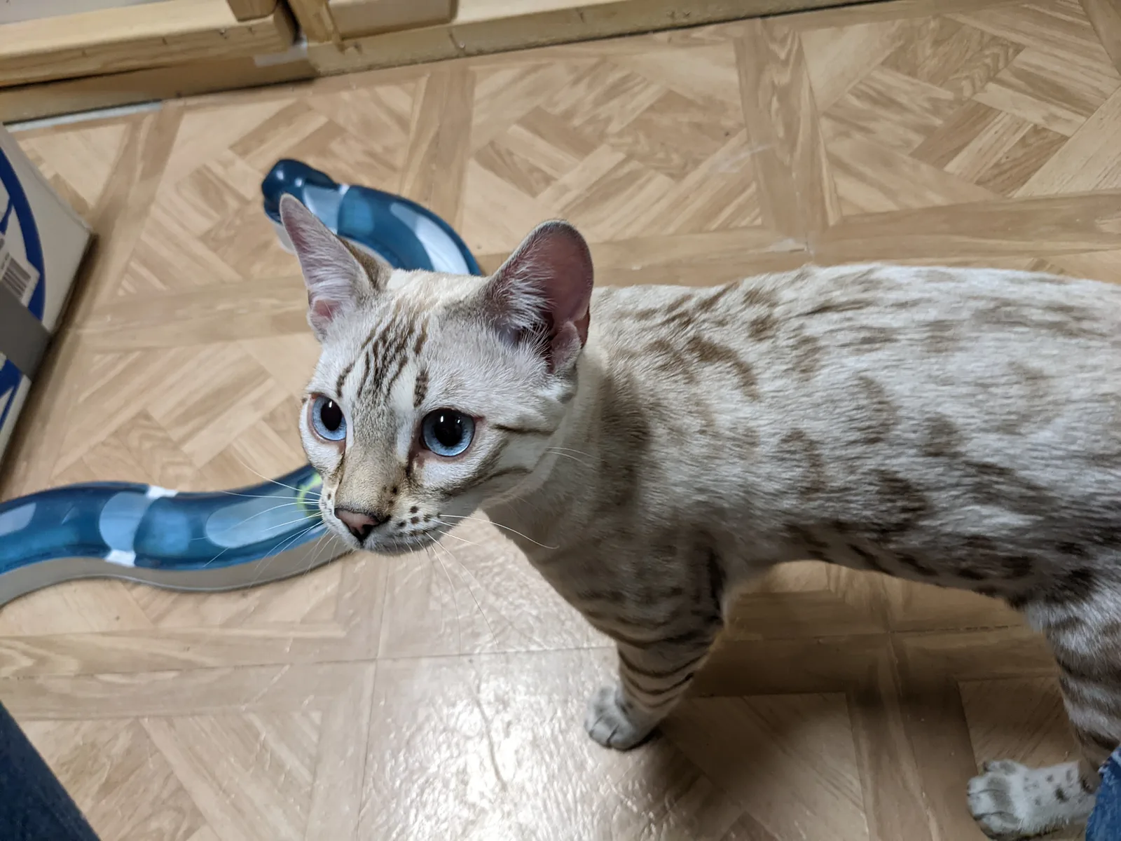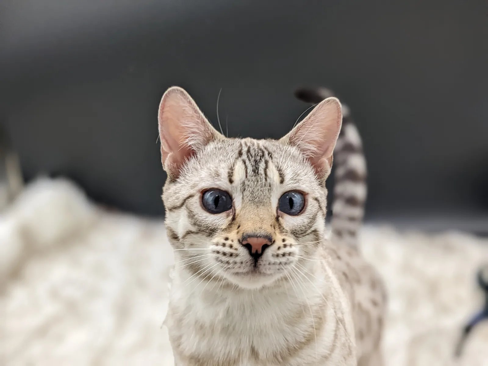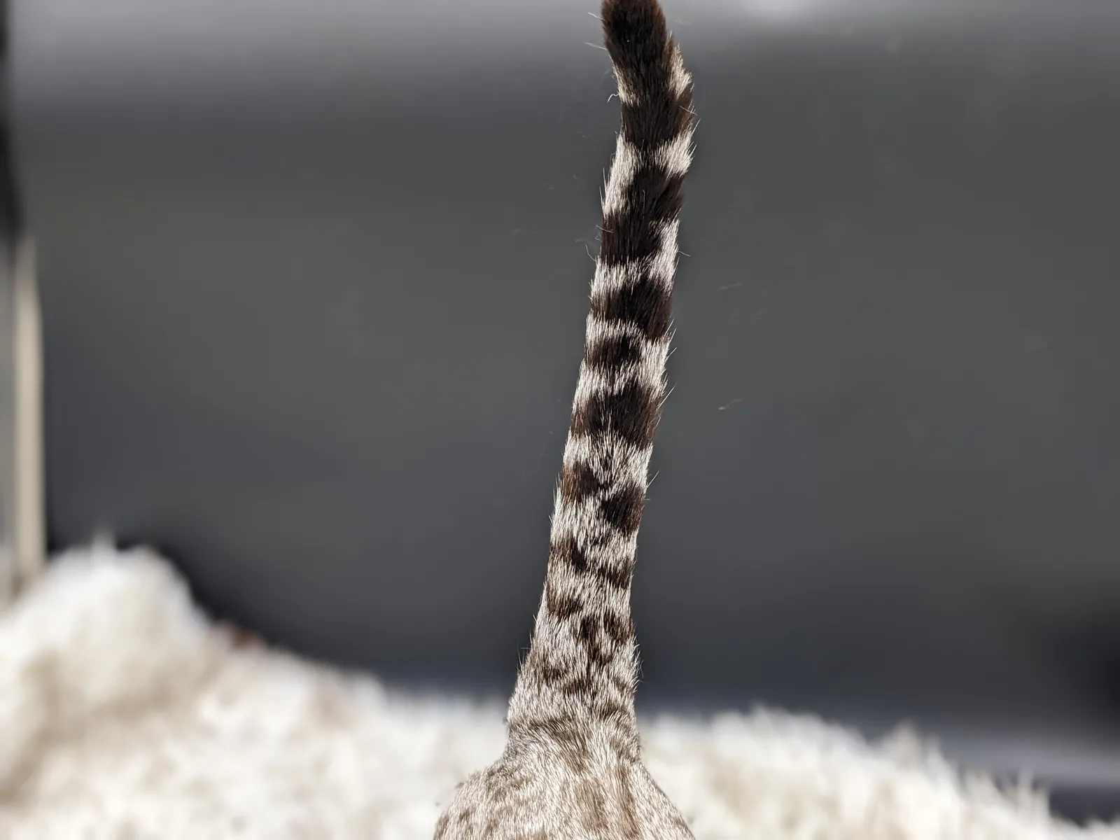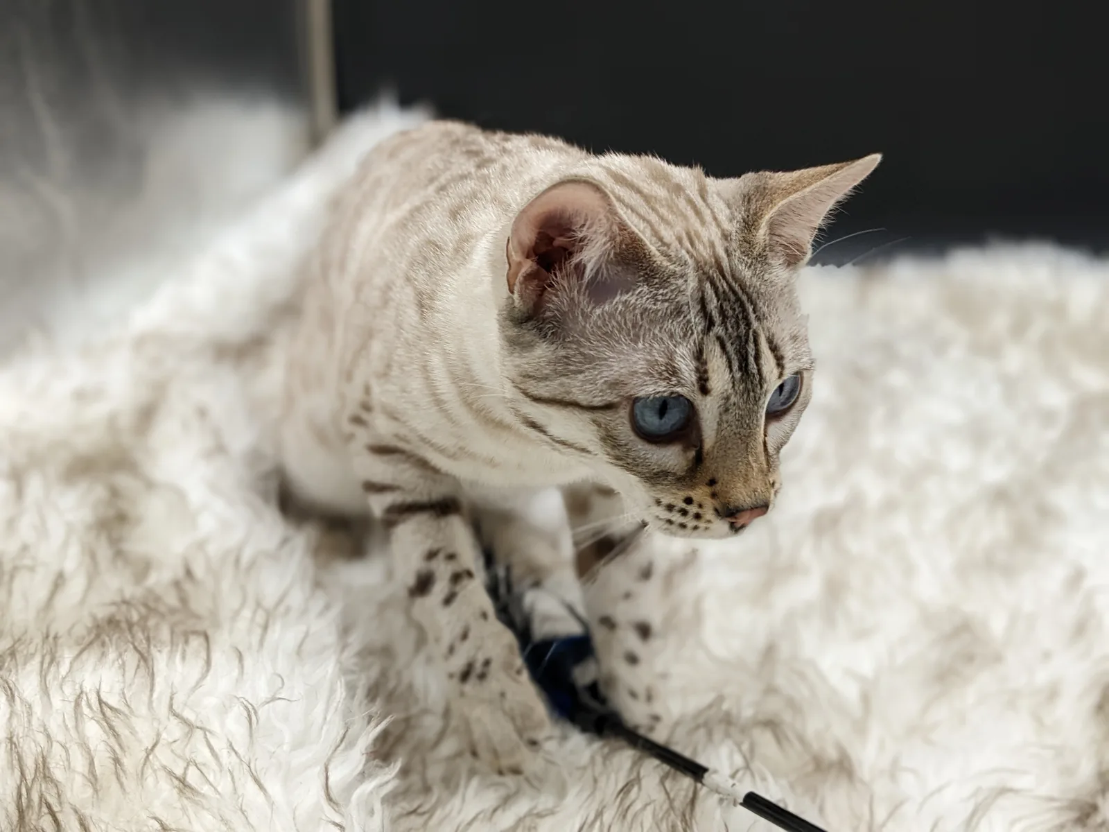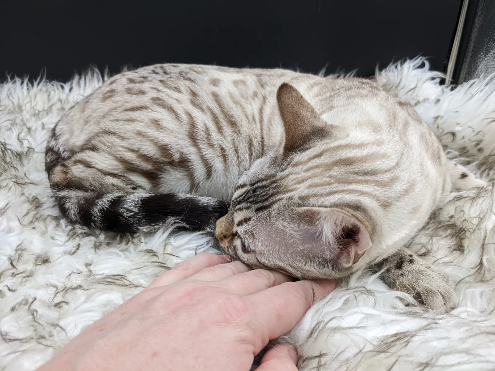 As a seal mink spotted torbie with glitter, she carries a truly exceptional color combination. Her warm mink tones, striking torbie patterning, and shimmering glitter coat are unlike anything else in our program — and what she brings genetically is just as exciting. Because Razz is homozygous for the leopard cat agouti gene (Apb/Apb), every kitten she has will carry it — and paired with CheeseTake, who carries the domestic non-agouti (a), charcoal-patterned kittens are possible in every litter. Between her 2 snow color genes (cs/cb) and CheeseTake's single color point (C/cs), kittens can come out brown, seal mink, or seal lynx point, with girls as torbies and boys potentially red.