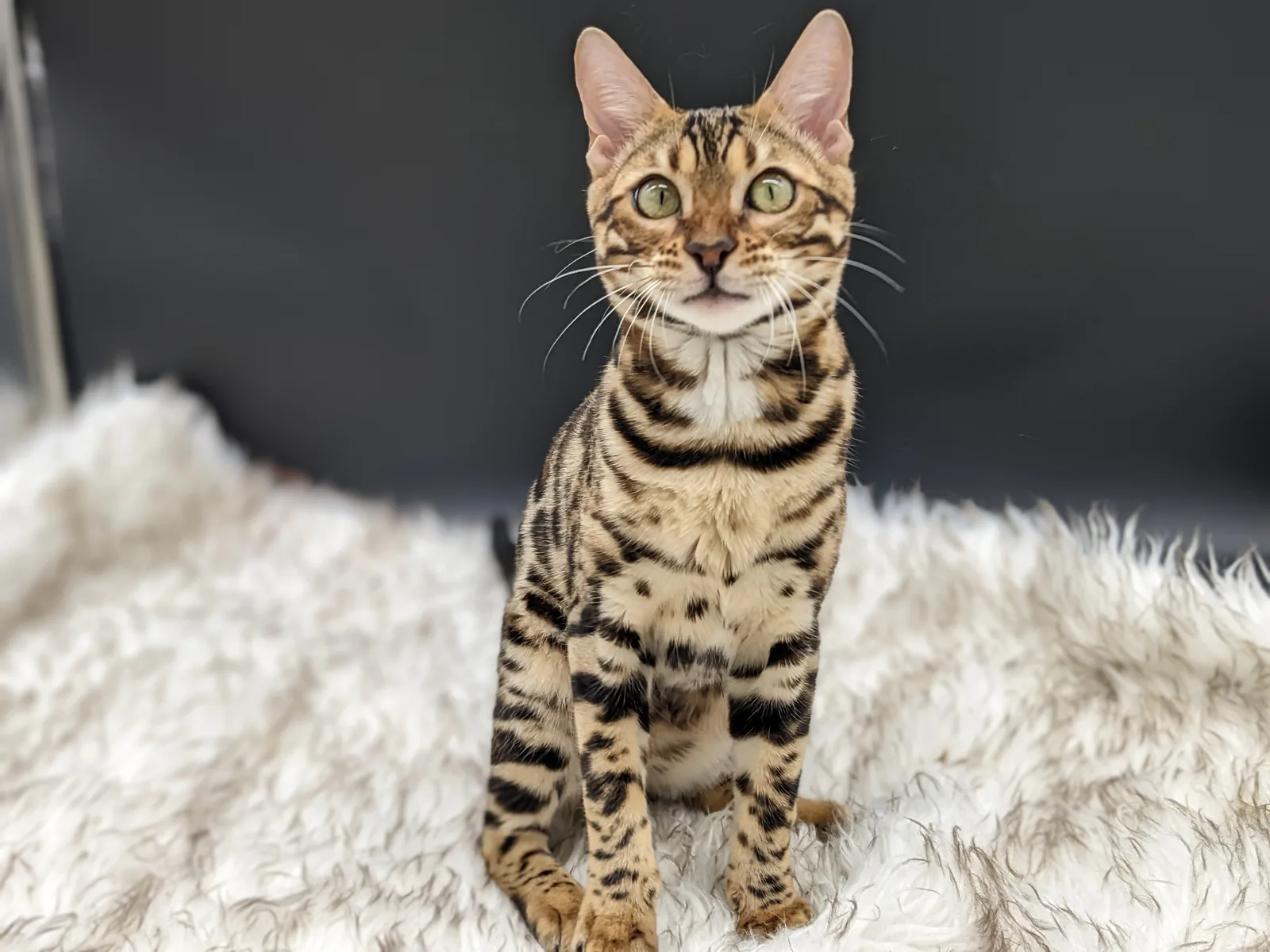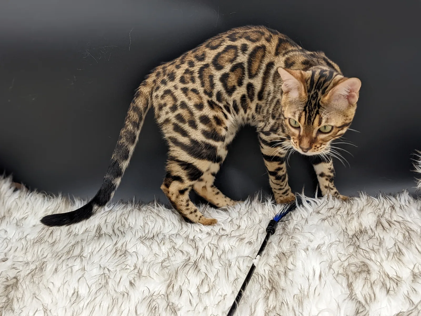 Razz came to us from Josh and Michelle Farnsworth at Cosmic Bengal, and she earned her place here through a combination of rare genetics and an even rarer temperament.