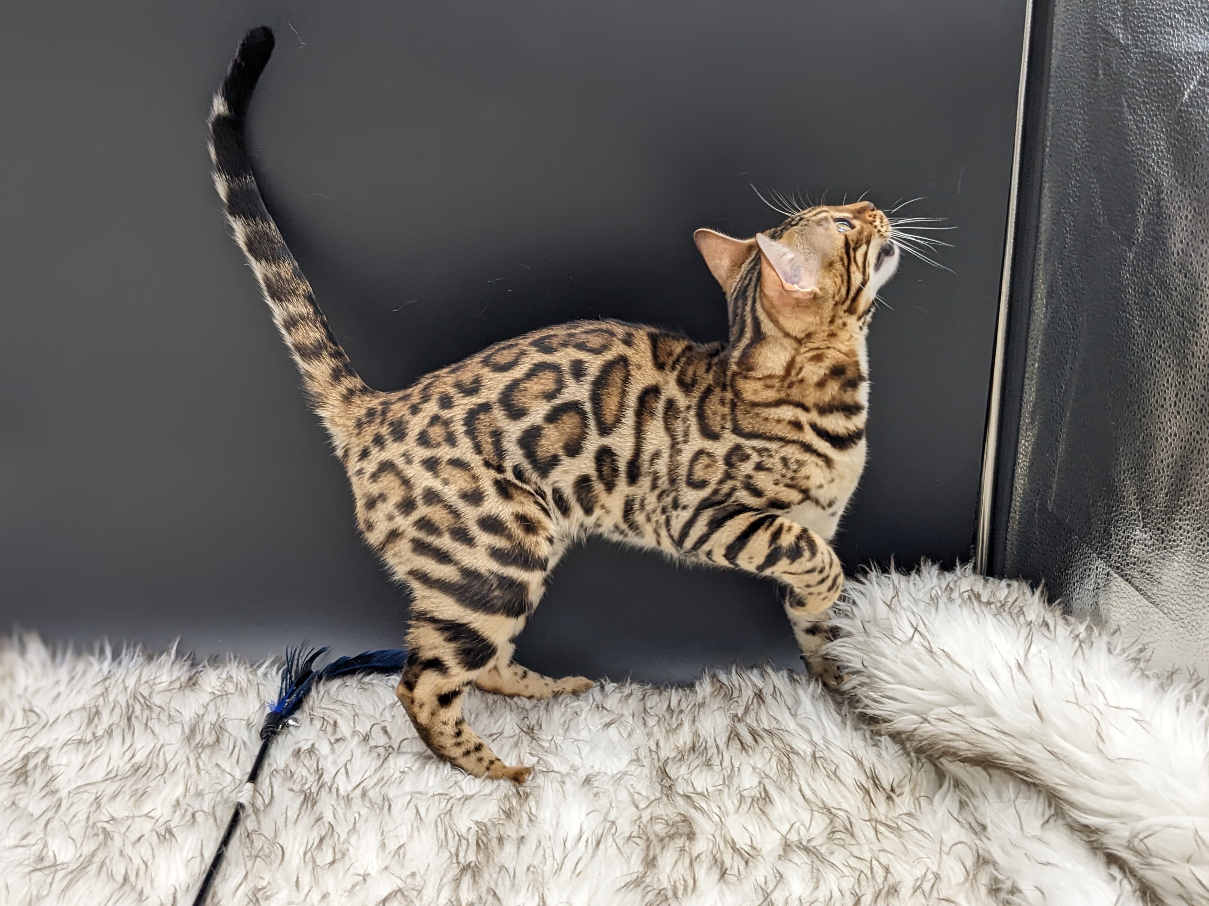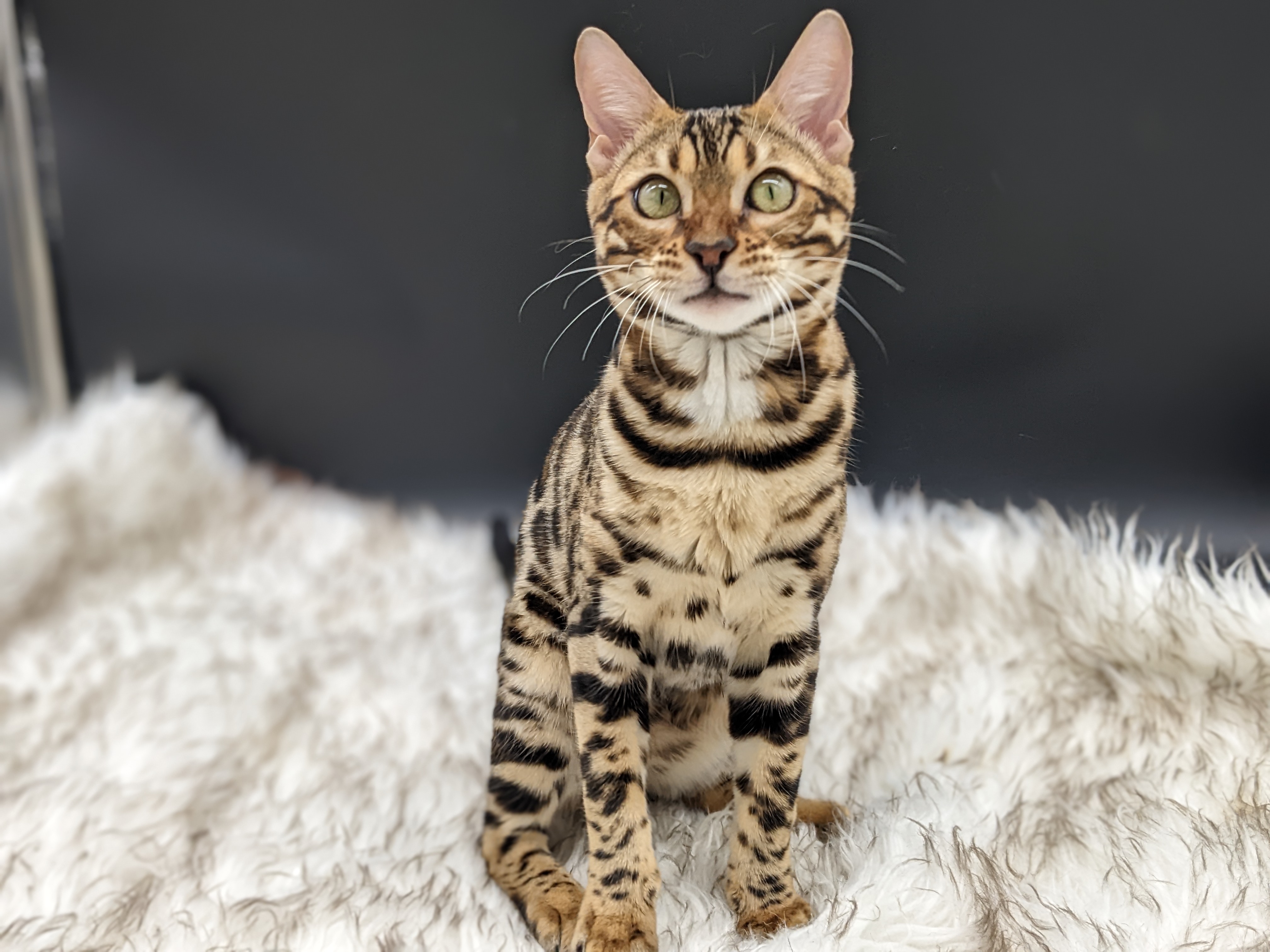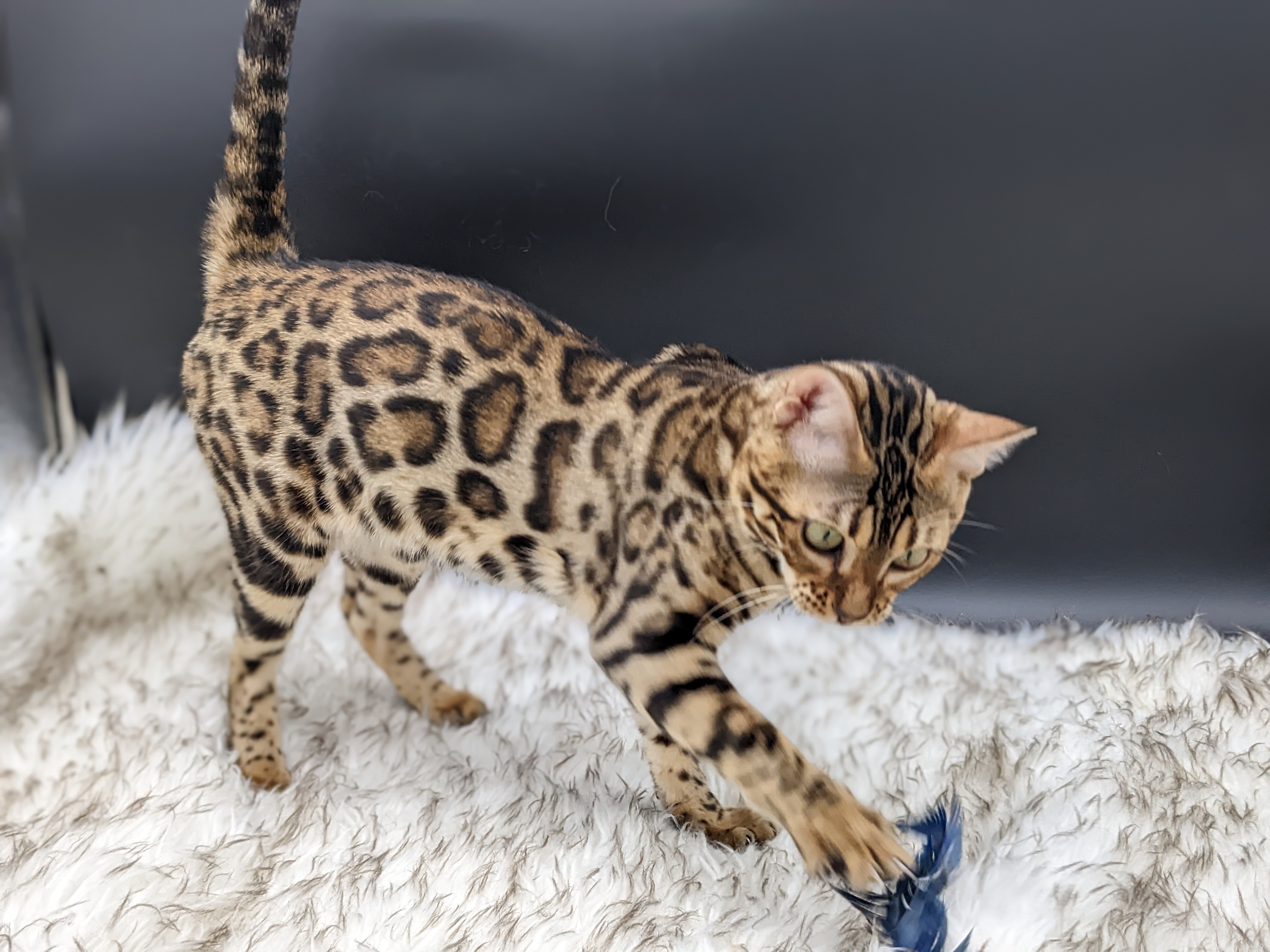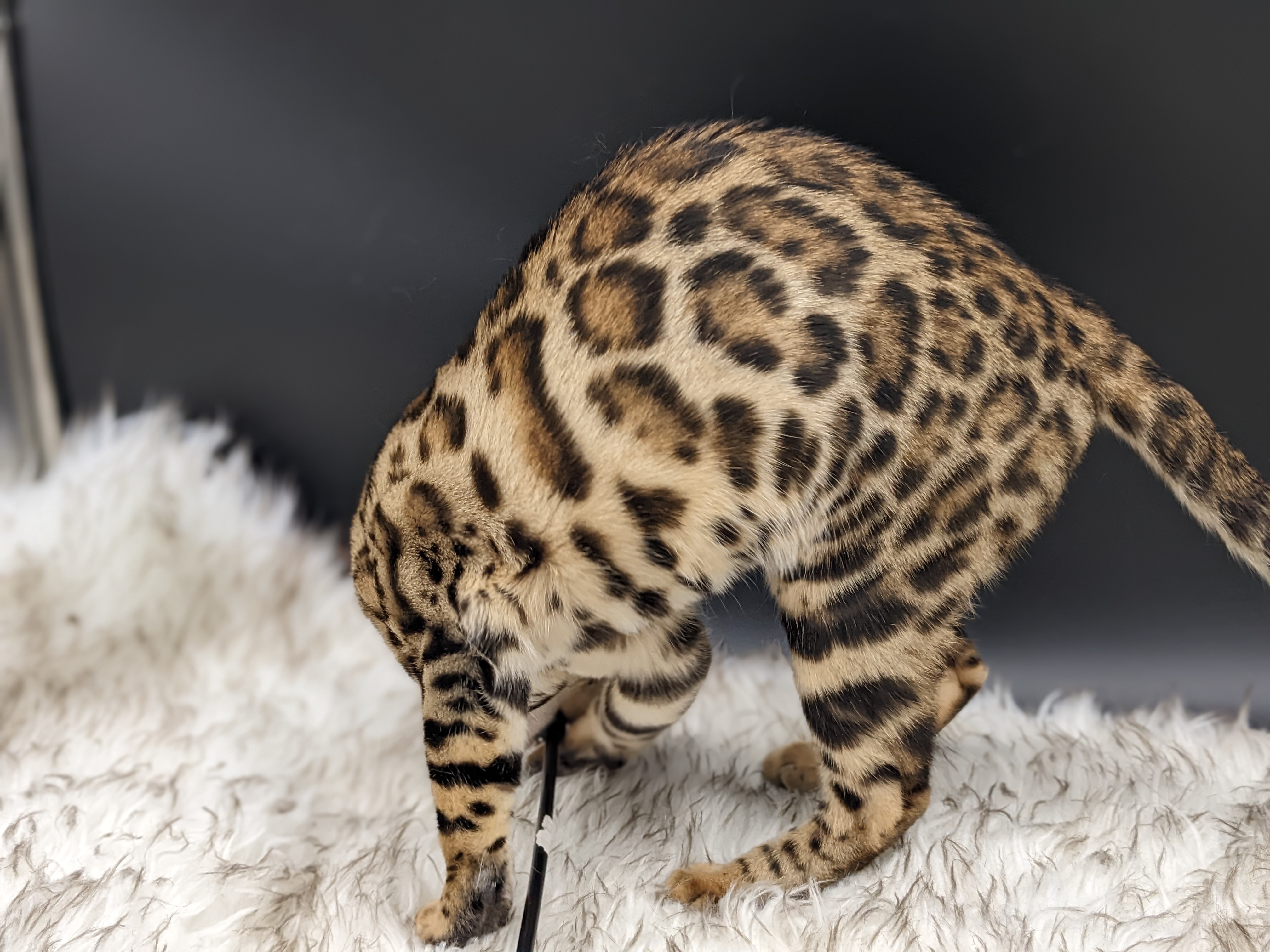 Ree is full sister to Roo. Ree also has that great horizontal flow she got from her mom, Rainforest Chim Chimeree. Ree carries one of the genetic components needed to produce charcoal patterned offspring. She is incredibly sweet and soft spoken. She likes being carried around and will happily purr away when you hold her like a baby. We love the look of her muzzle and she also has a checkered tail! We're very excited to see what she produces with the right male.