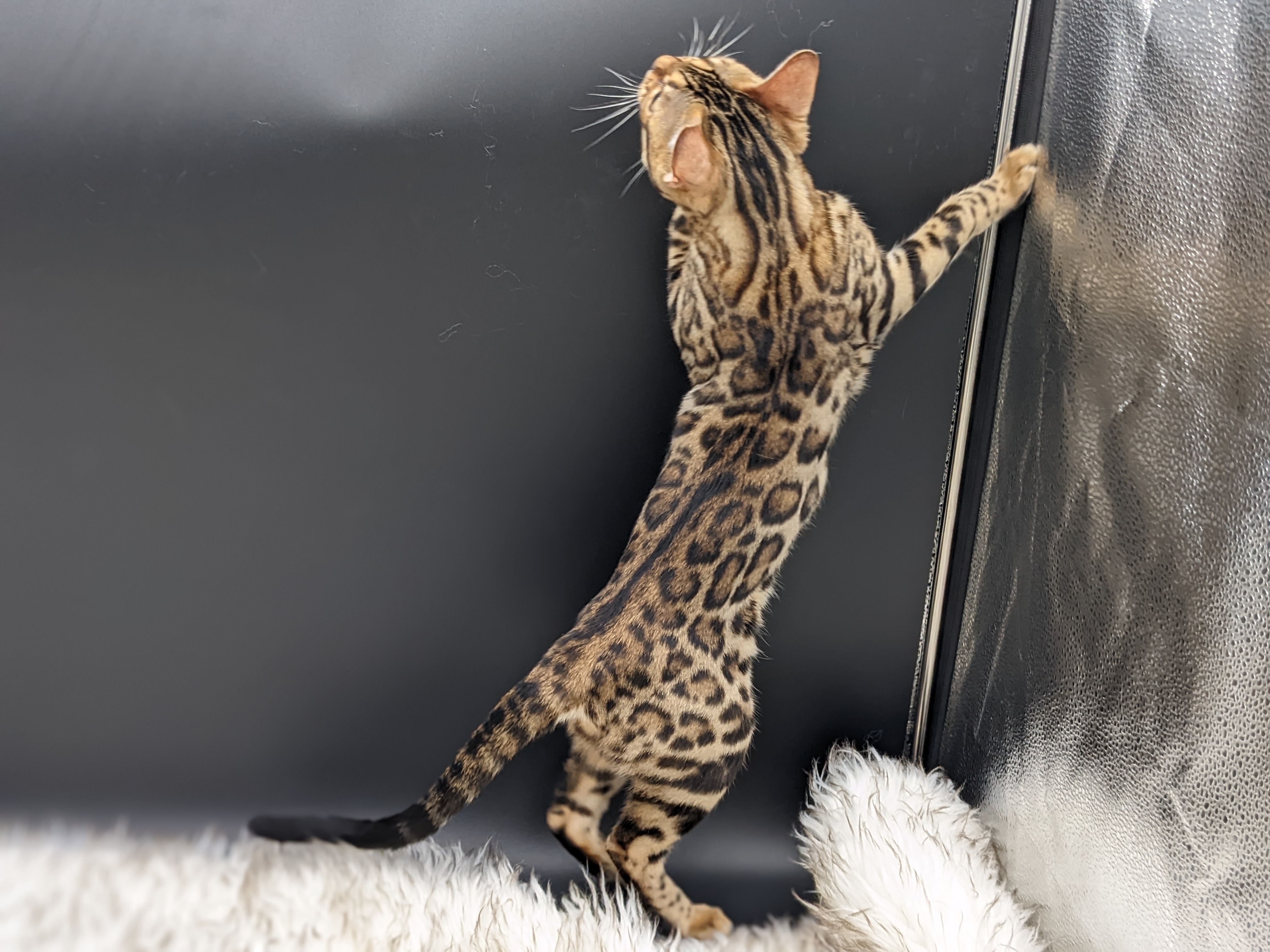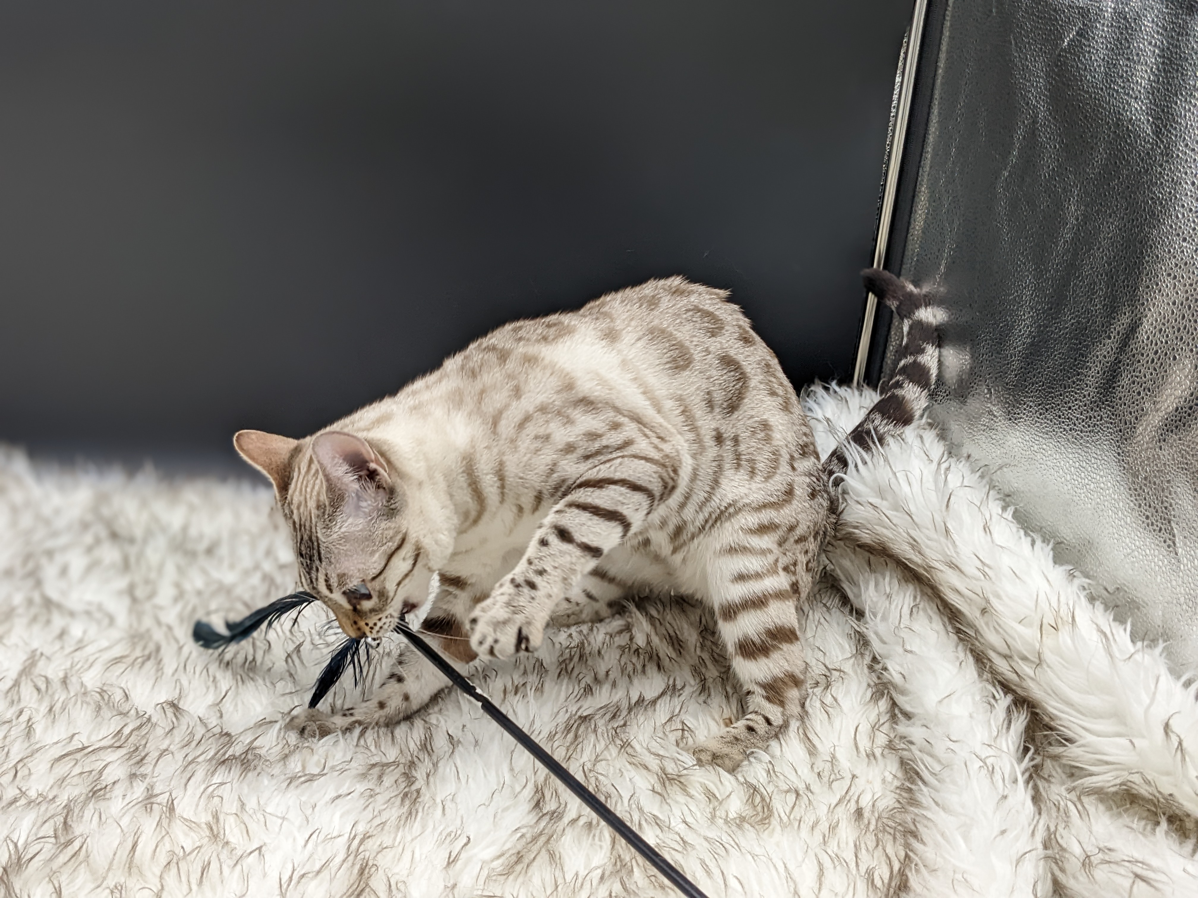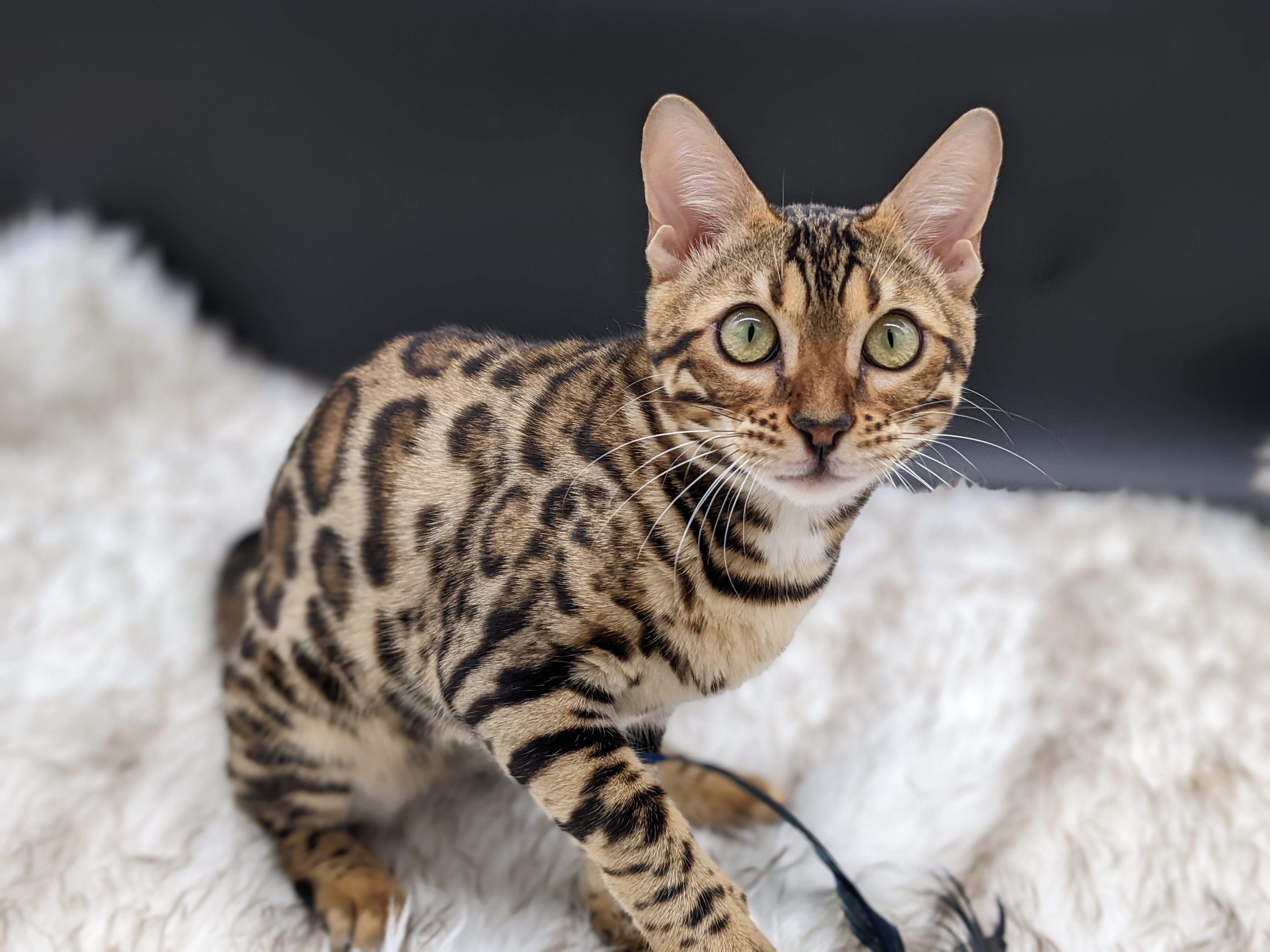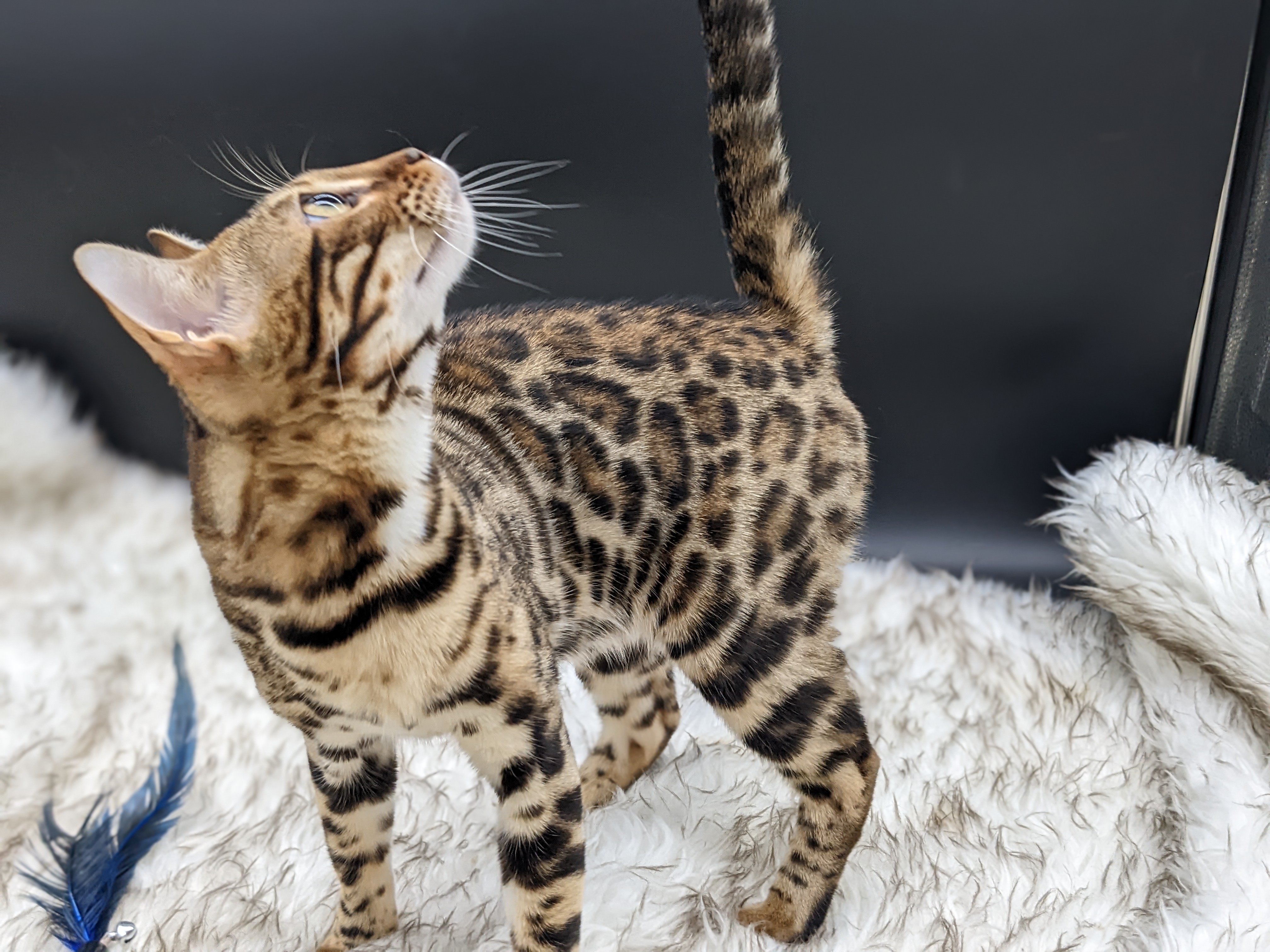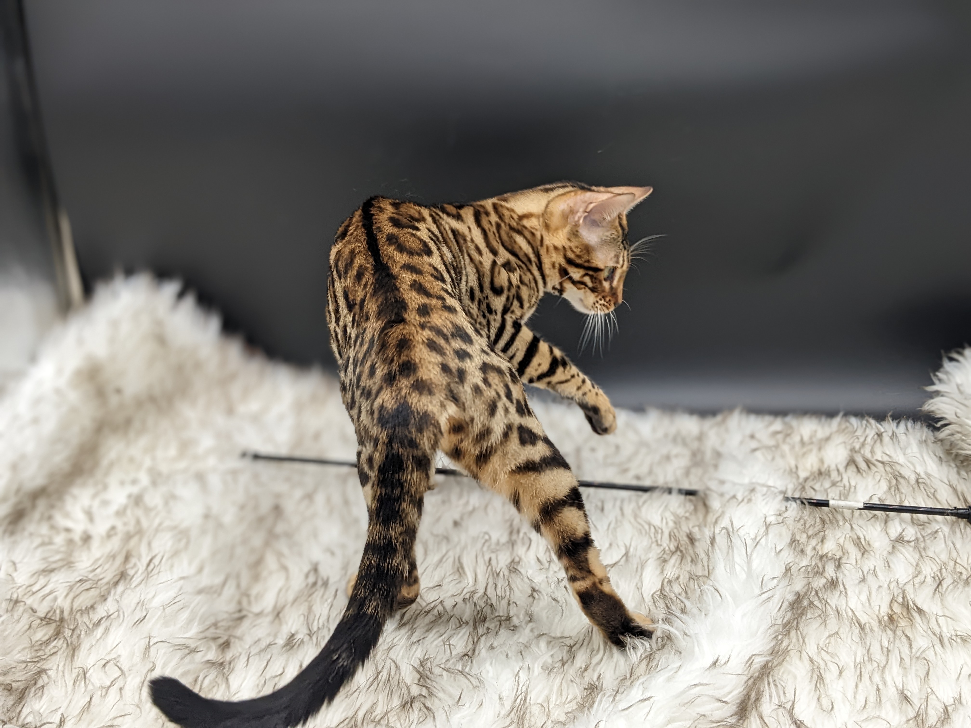 Ree is full sister to Roo. Ree also has that great horizontal flow she got from her mom, Rainforest Chim Chimeree. Ree carries one of the genetic components needed to produce charcoal patterned offspring. She is incredibly sweet and soft spoken. She likes being carried around and will happily purr away when you hold her like a baby. We love the look of her muzzle and she also has a checkered tail! We're very excited to see what she produces with the right male.