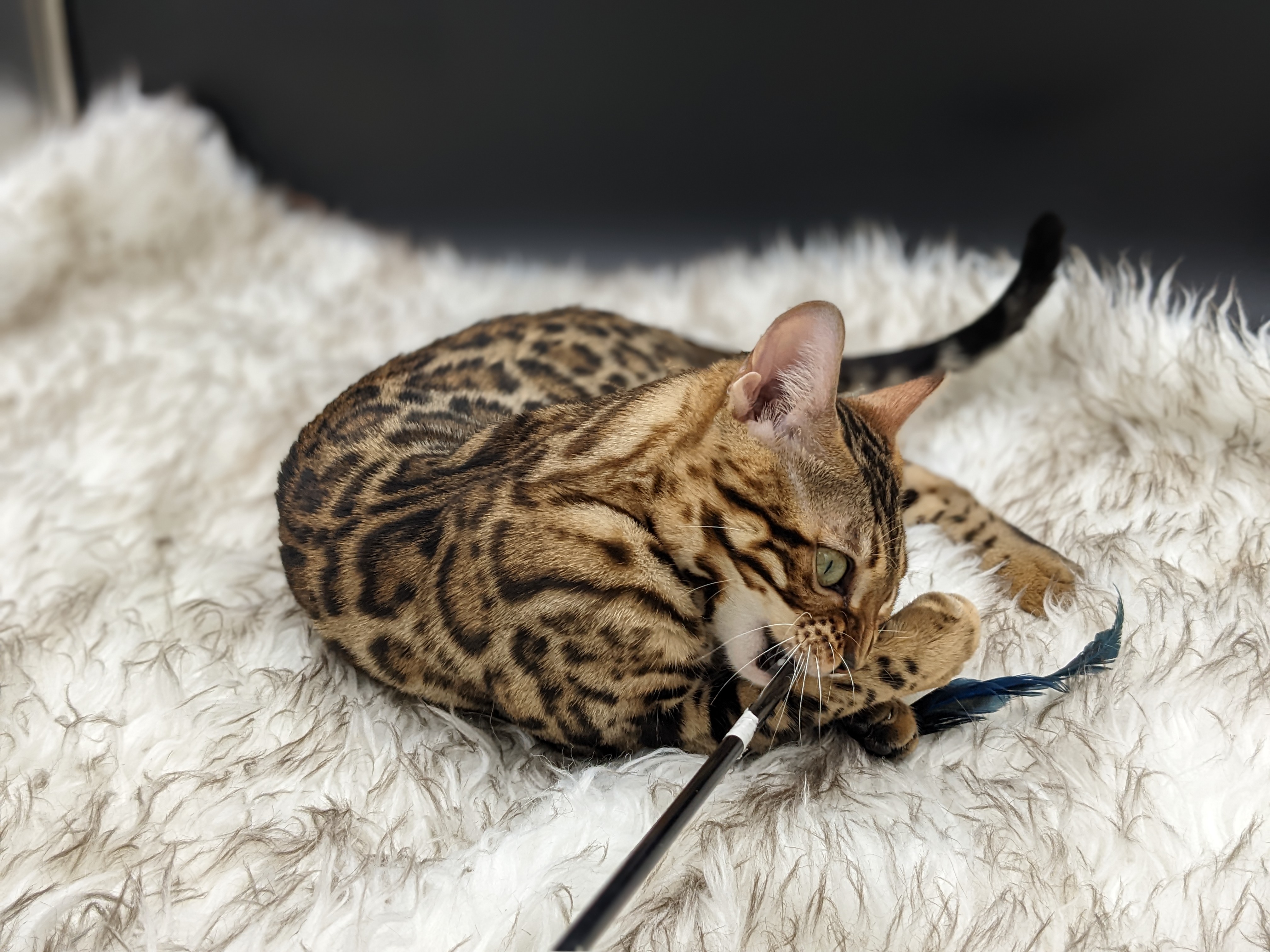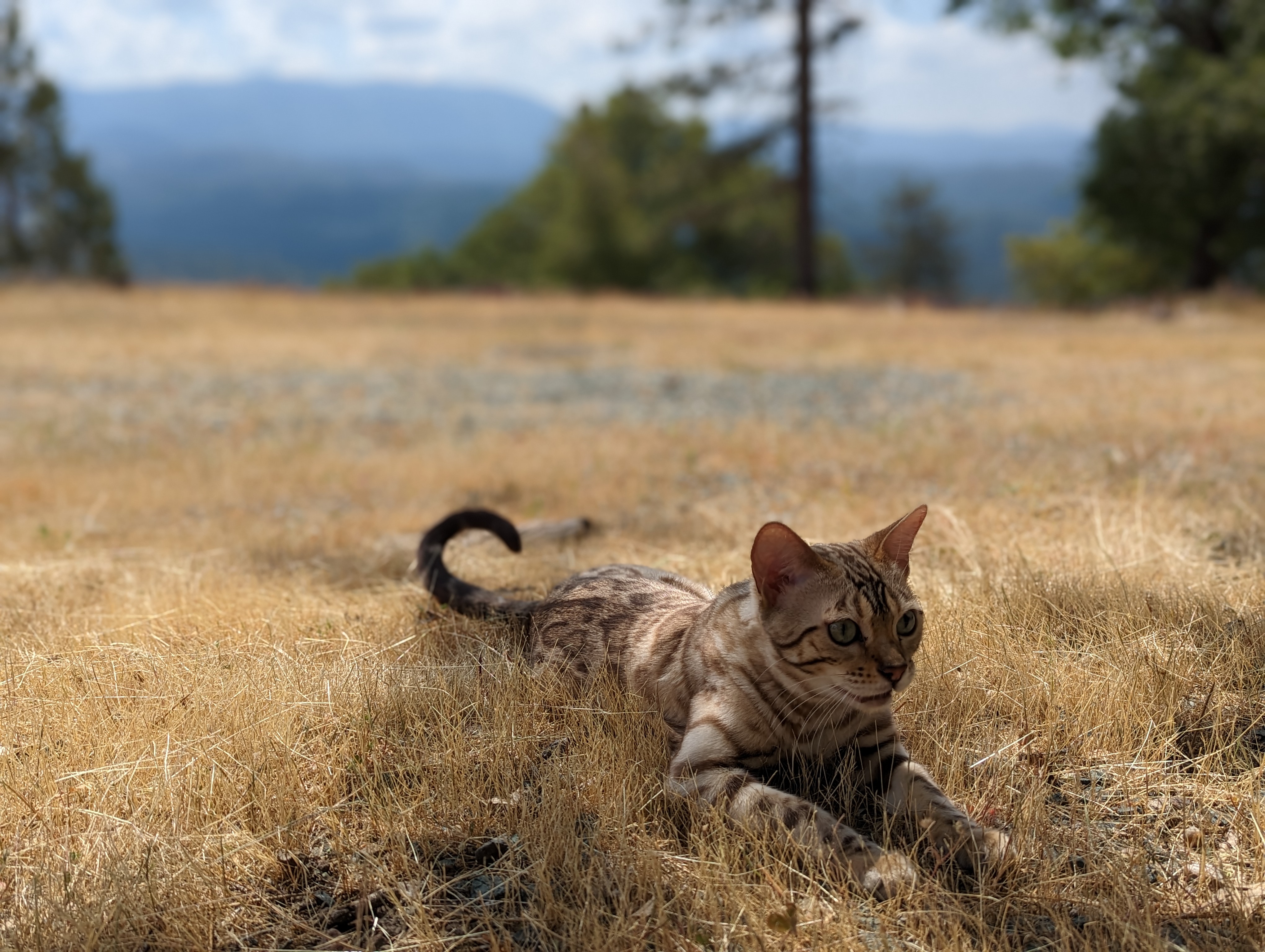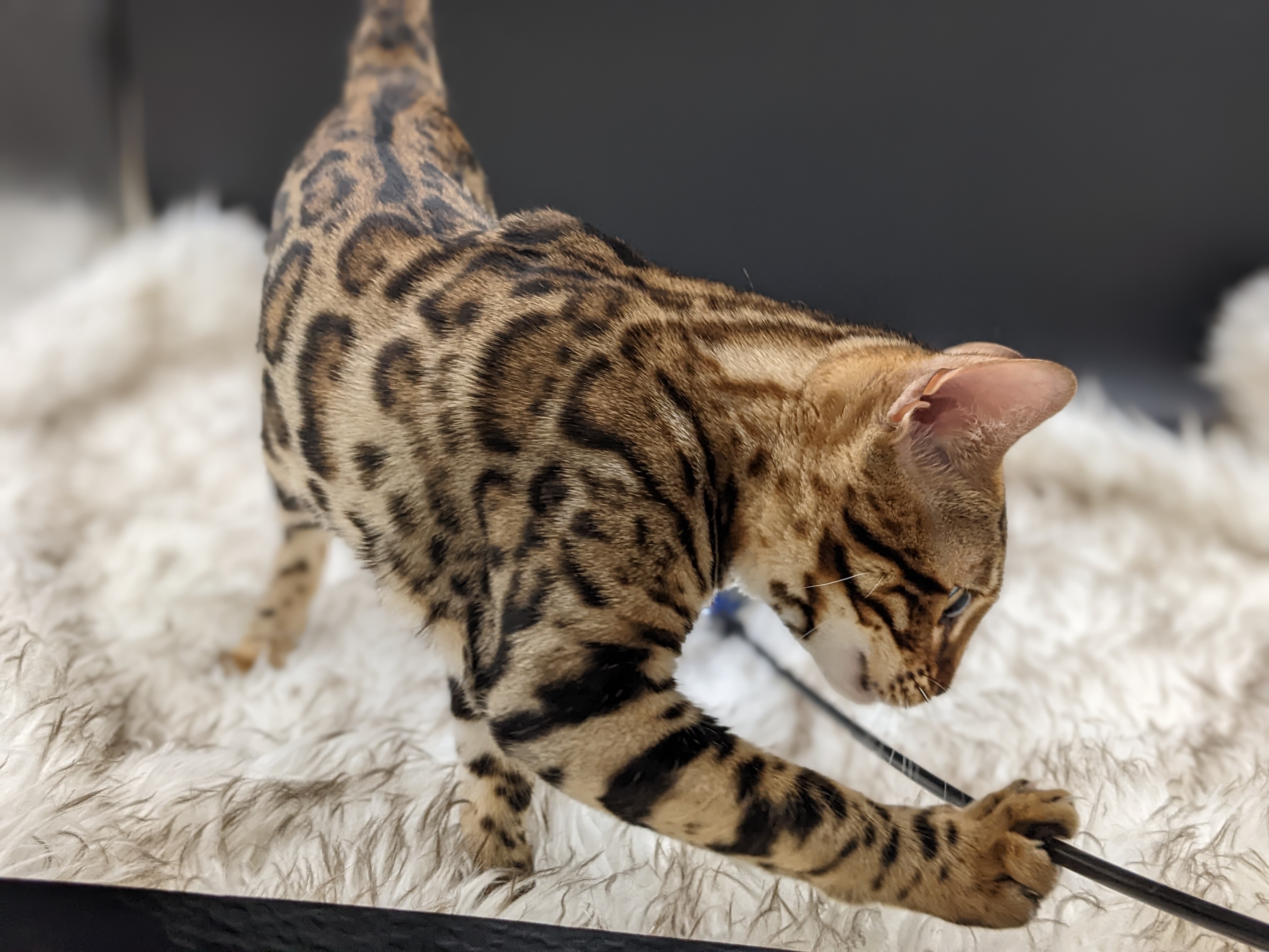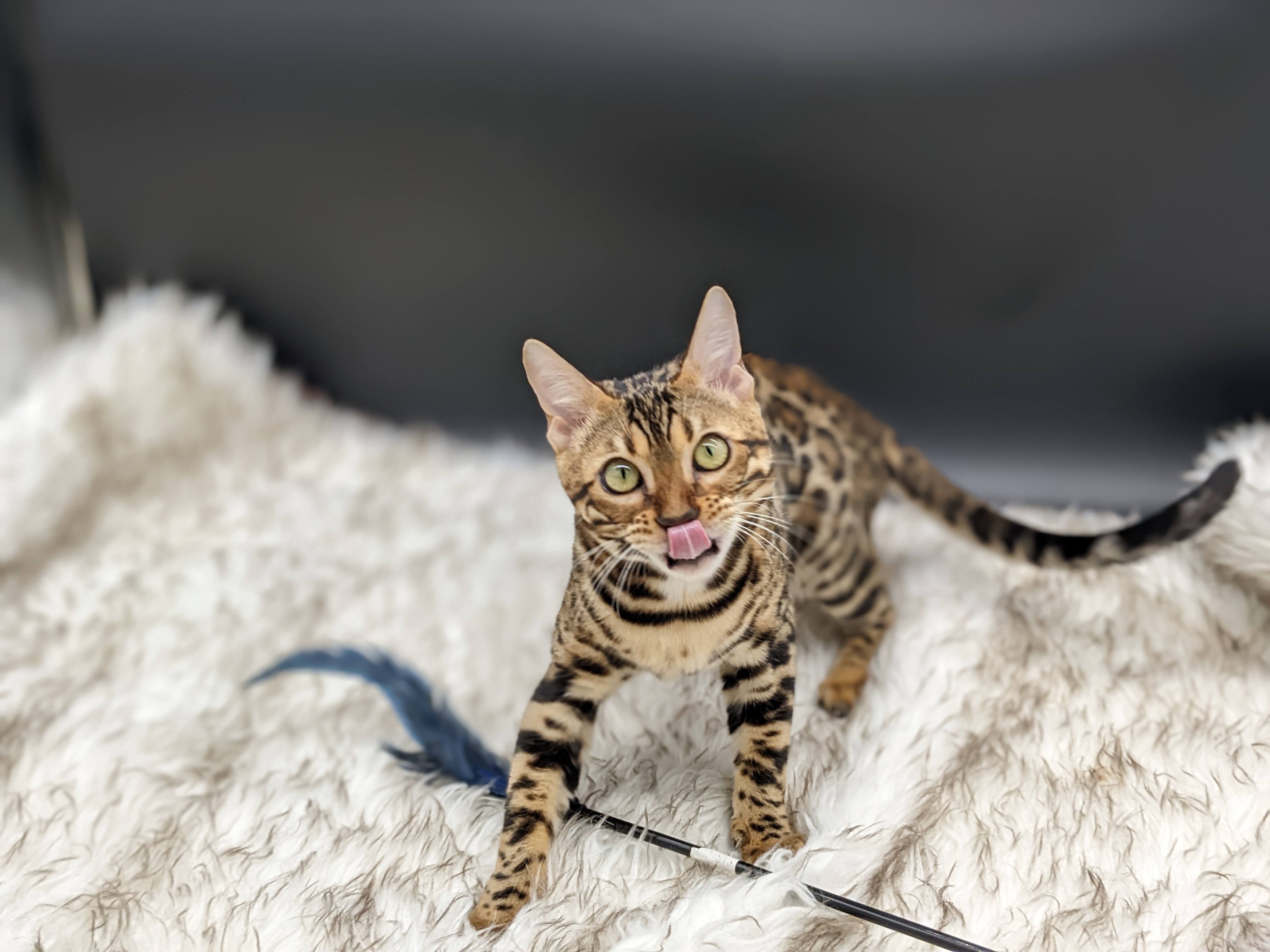 Ree is full sister to Roo. Ree also has that great horizontal flow she got from her mom, Rainforest Chim Chimeree. Ree carries one of the genetic components needed to produce charcoal patterned offspring. She is incredibly sweet and soft spoken. She likes being carried around and will happily purr away when you hold her like a baby. We love the look of her muzzle and she also has a checkered tail! We're very excited to see what she produces with the right male.